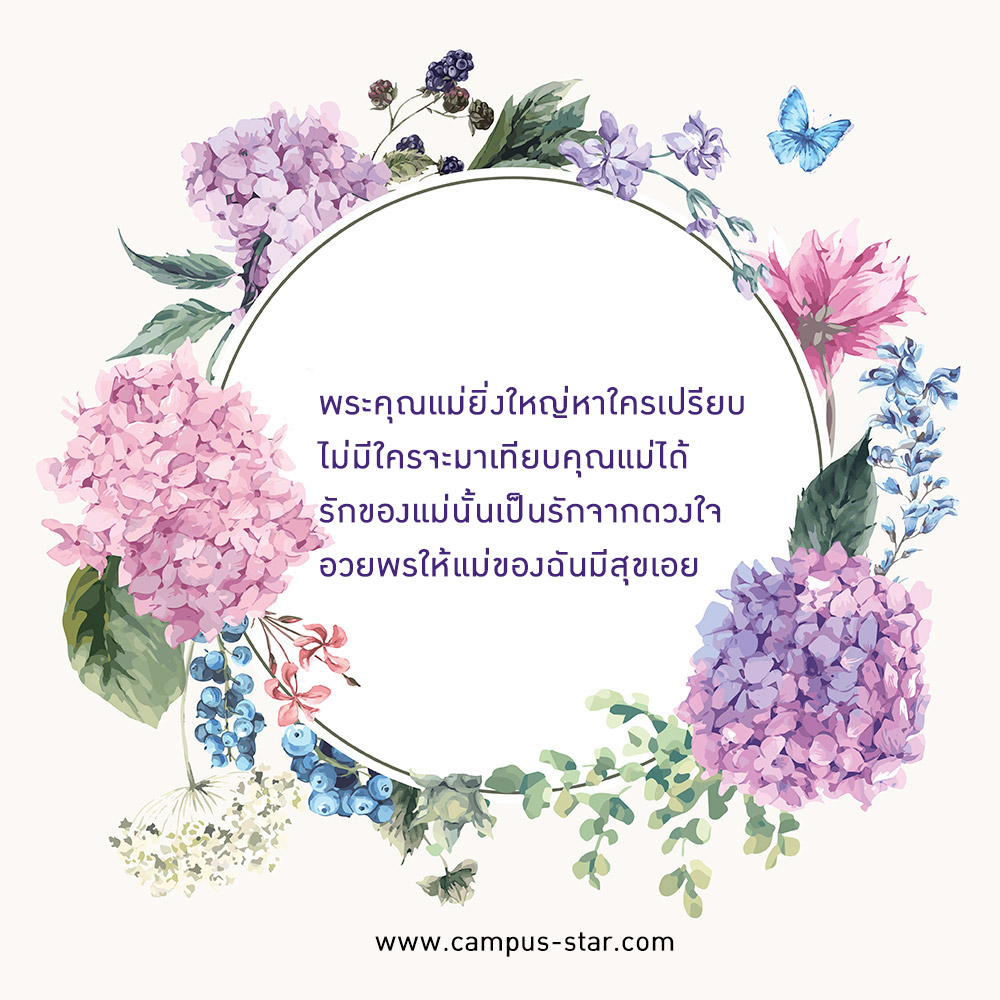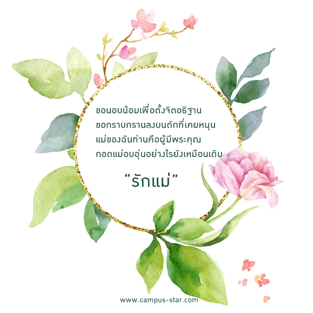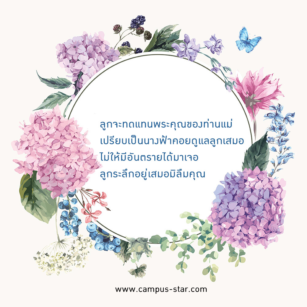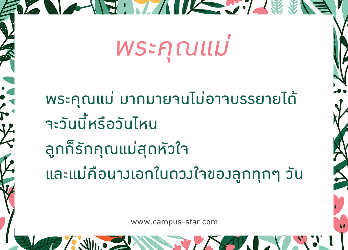 เคยรวบรวมคำอวยพรวันแม่แบบภาษาอังกฤษกันไปแล้ว วันนี้ Campus-star ขอรวบรวม คำอวยพรวันแม่ ภาษาไทย เป็นประโยคซึ้งๆ กลอนภาษาไทย มาให้ทุกคน ได้ลองเลือกไปเขียนลงในการ์ดให้คุณแม่กันนะคะ หรือจะส่งข้อความผ่านทางไลน์ก็ได้นะ เผื่อใครที่เขินคิดไม่ออก ลองอ่านเป็นไอเดียได้ค่ะ