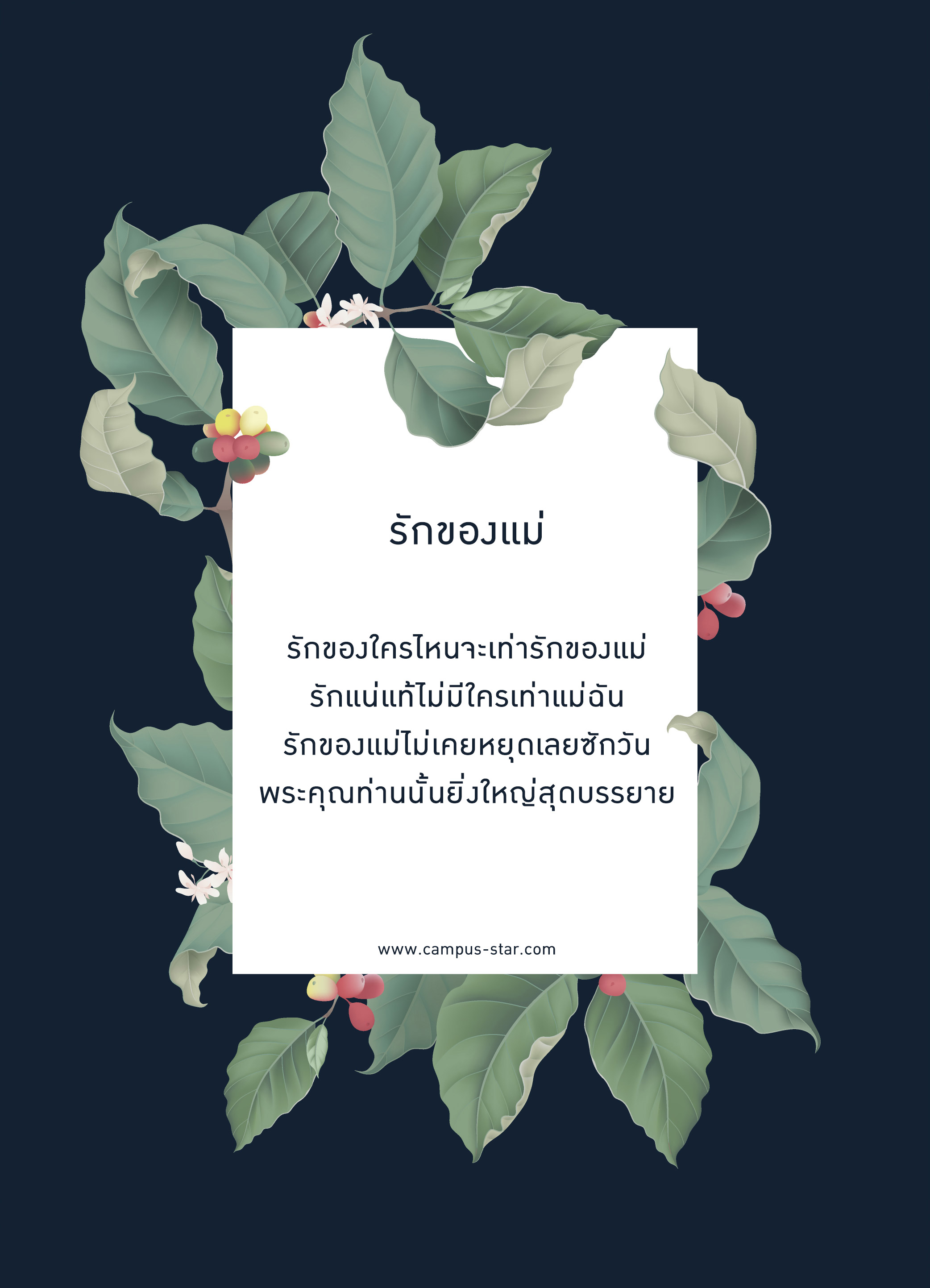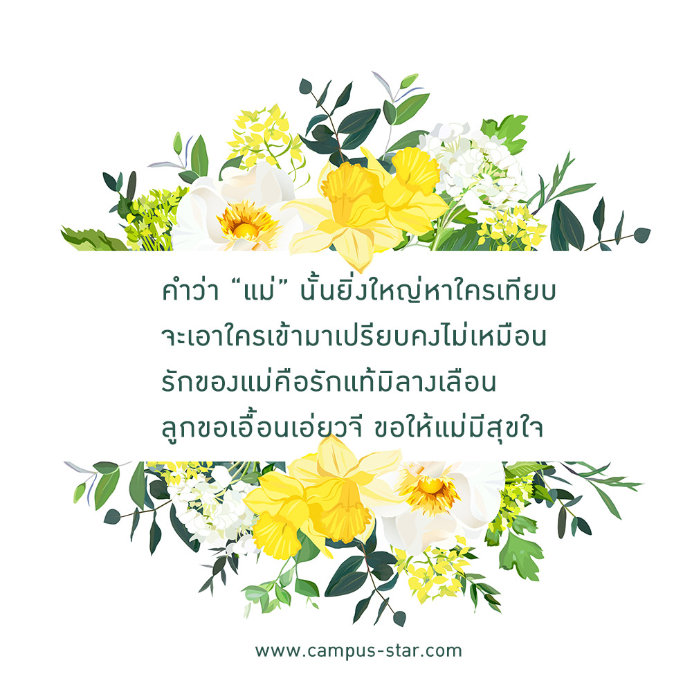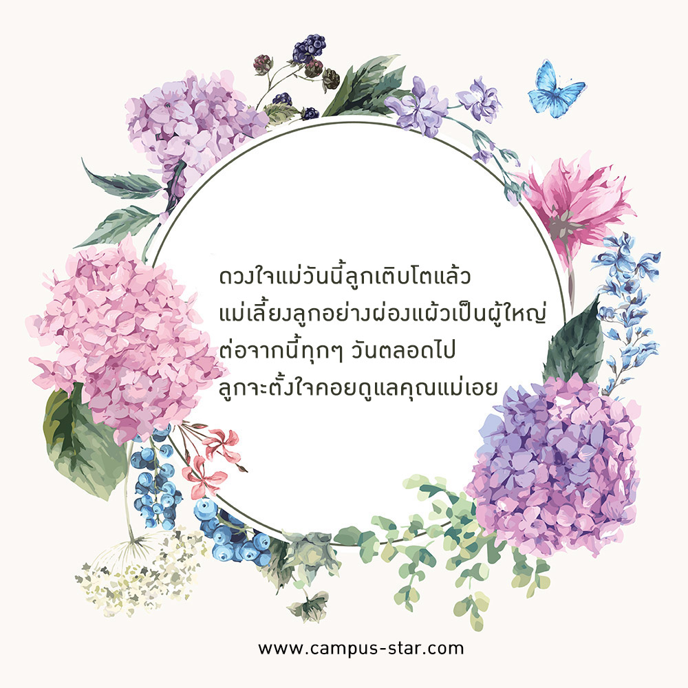 เคยรวบรวมคำอวยพรวันแม่แบบภาษาอังกฤษกันไปแล้ว วันนี้ Campus-star ขอรวบรวม คำอวยพรวันแม่ ภาษาไทย เป็นประโยคซึ้งๆ กลอนภาษาไทย มาให้ทุกคน ได้ลองเลือกไปเขียนลงในการ์ดให้คุณแม่กันนะคะ หรือจะส่งข้อความผ่านทางไลน์ก็ได้นะ เผื่อใครที่เขินคิดไม่ออก ลองอ่านเป็นไอเดียได้ค่ะ