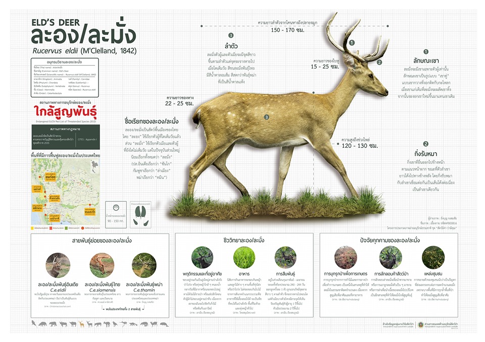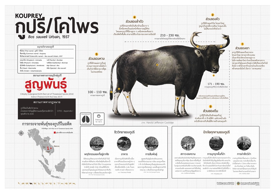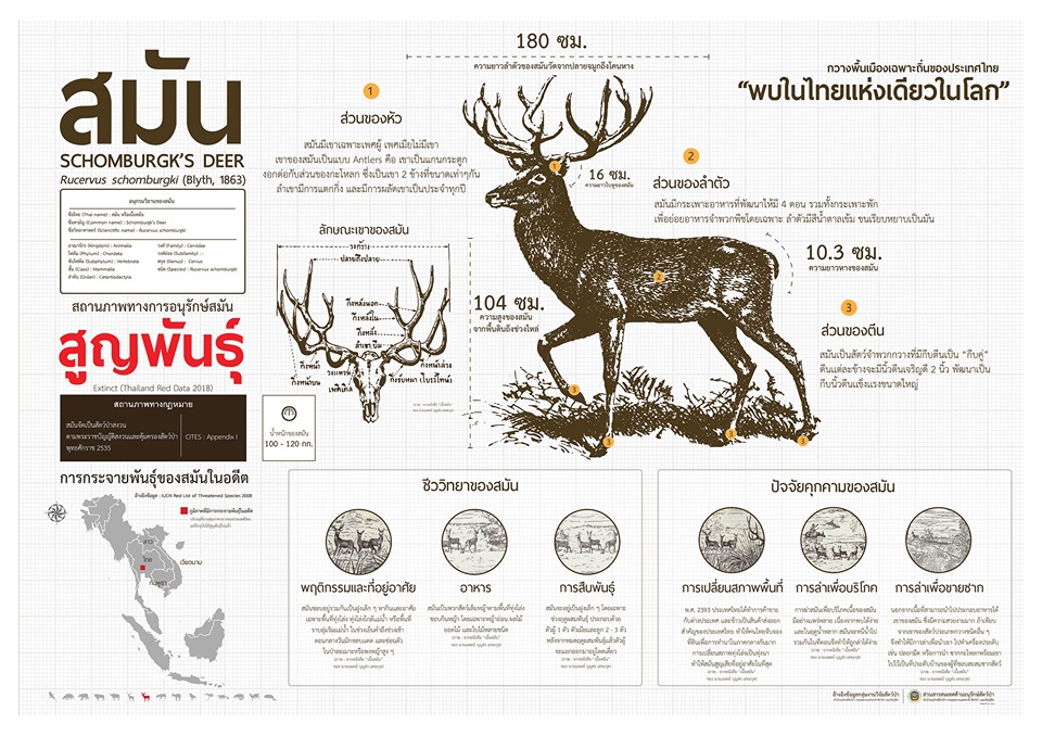 ในโปสเตอร์ได้ให้ความรู้เกี่ยวกับ ส่วนสูง ความยาว ส่วนของลำตัว ส่วนของหัว ขน ตีน สายพันธุ์ย่อย ชีววิทยา ป้จจัยคุกคามต่างๆ รวมถึง สถานภาพทางการอนุรักษ์ ที่จะบอกว่า สูญพันธุ์ ใกล้สูญพันธุ์ สูญพันธุ์เป็นอย่างยิ่ง มีแนวโน้มใกล้สูญพันธุ์ โดยใน 15 ชนิดนั้น มีสัตว์สองประเภทที่ “สูญพันธุ์” ไปแล้ว คือ กูปรี/โคไพร และสมัน (ซึ่งสมันเป็นกวางพื้นเมืองเฉพาะถิ่นของประเทศไทย พบในไทยแห่งเดียวในโลก)