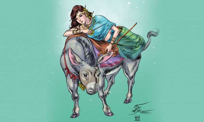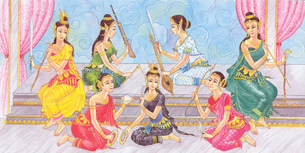 นางมณฑาเทวี ทรงพาหุรัด ทัดดอกจำปา อาภรณ์แก้วไพฑูรย์ ภักษาหารนมเนย หัตถ์ขวาทรงเหล็กแหลม หัตถ์ซ้ายทรงไม้เท้า เสด็จไสยาสน์ลืมเนตร(นอนลืมตา) มาเหนือหลังคัสพะ (ลา) เป็นพาหนะ