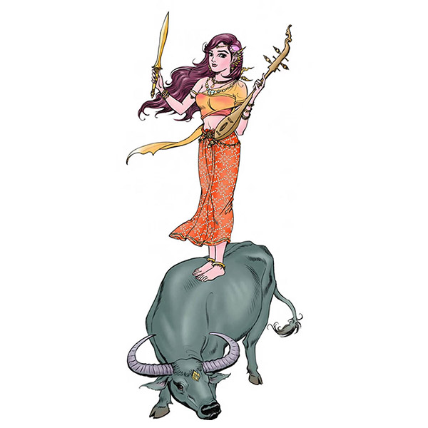 นางมโหธรเทวี ทรงพาหุรัด ทัดดอกสามหาว (ผักตบชวา) อาภรณ์แก้วนิลรัตน์ ภักษาหารเนื้อทราย หัตถ์ขวาทรงจักร หัตถ์ซ้ายทรงตรีศูล เสด็จยืน มาเหนือหลังมยุรา (นกยูง) เป็นพาหนะ