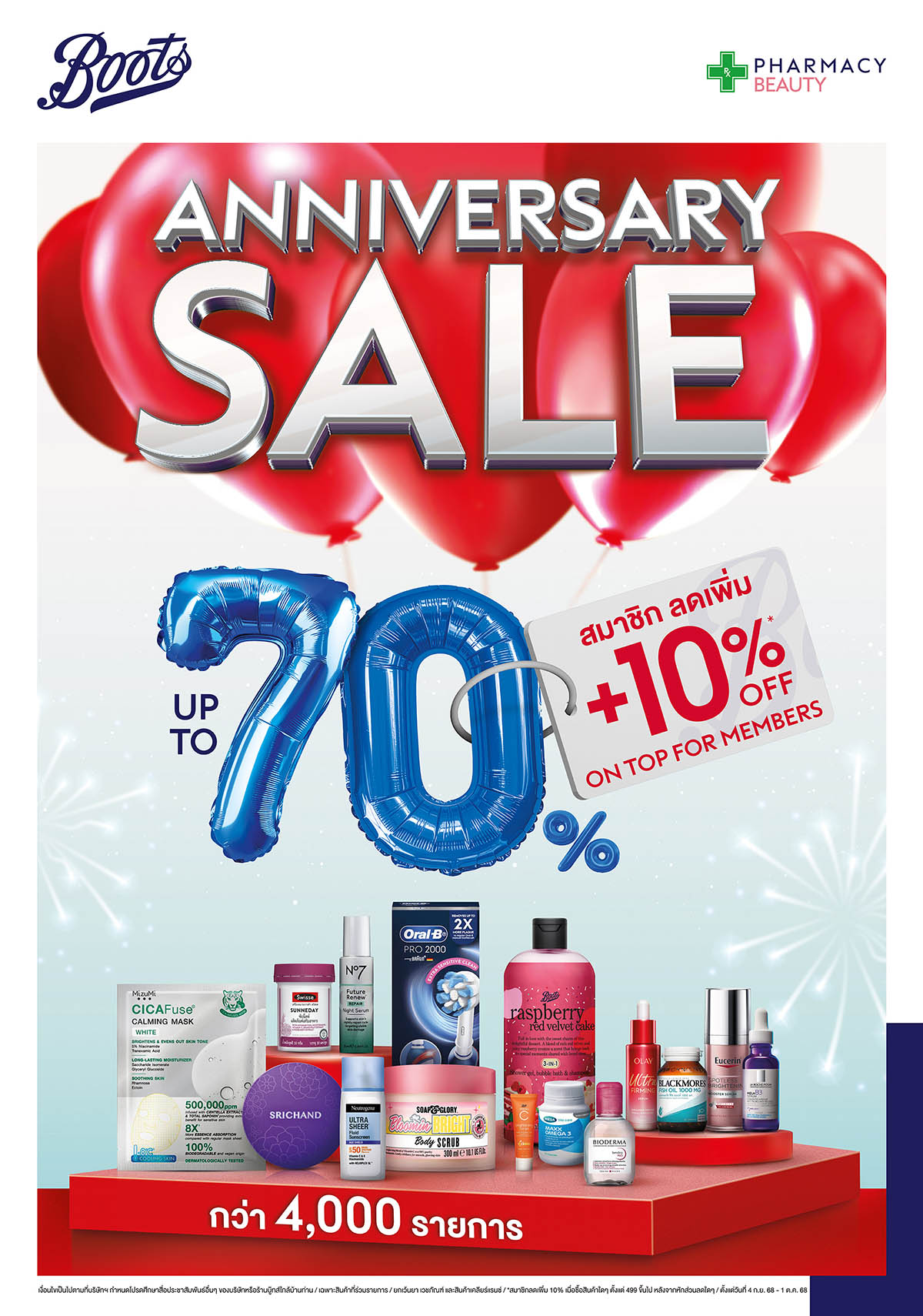 พบกับโซนไฮไลท์ใหม่ อาทิ โซนยาและเวชภัณฑ์, โซนผลิตภัณฑ์เวชสำอาง (Derma Skincare), โซนให้คำปรึกษาเกี่ยวกับความงามและวิตามิน พร้อมส่งโปรโมชั่นพิเศษ ‘Boots Anniversary Sales’ ยกทัพสินค้ากว่า 4,000 รายการ ลดสูงสุด 70% พิเศษ! สำหรับ “สมาชิกบู๊ทส์รับส่วนลดเพิ่ม On-top 10%” ให้ลูกค้าร่วมช้อปแบรนด์ใหม่และเอ็กซ์คลูซีฟแบรนด์จากบู๊ทส์ ได้แก่ Boots Dermacare, No7, 17 Cosmetics, Soap & Glory, Umberto Gianni, Soltan Suncare, Ted Baker, Nature Series, Vitamin C และทัพแบรนด์ดังมากมาย