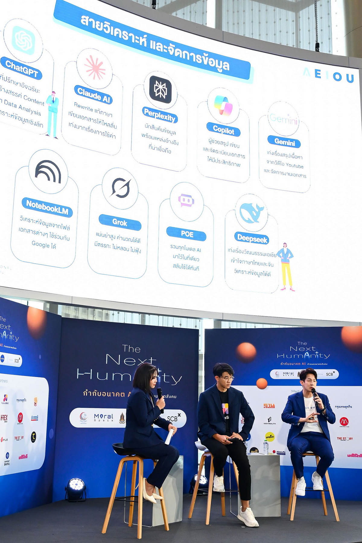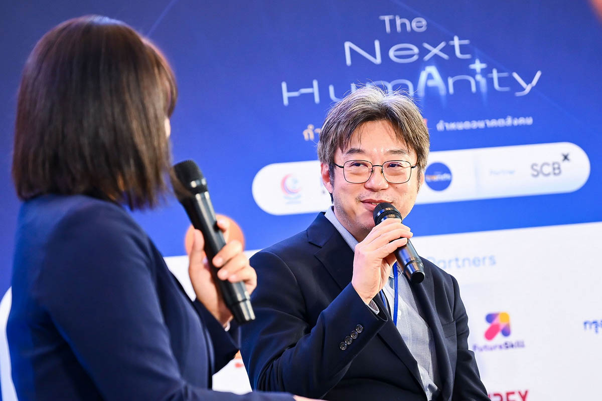 เวทีเสวนา “Deep Dive Panel: AI at Work” โดยมี แทนพงศ์ CPO จาก FutureSkill และ ปฤณ จำเริญพานิช Co-Founder & CEO of AEIOU ได้ให้ข้อสรุปสำคัญสำหรับคนทำงานยุคใหม่ โดยชี้ว่ามนุษย์ต้องปล่อยให้ AI จัดการงานที่เน้นปริมาณ และความรวดเร็ว (Scale & Speed) แล้วหันมาสร้างคุณค่าในงานที่ต้องใช้ความรู้สึก และจิตวิญญาณ (Sense & Soul) และความเป็นมนุษย์ และต้องหันกลับมาให้ความสำคัญกับการพัฒนาตัวเองในเรื่องต่างๆ