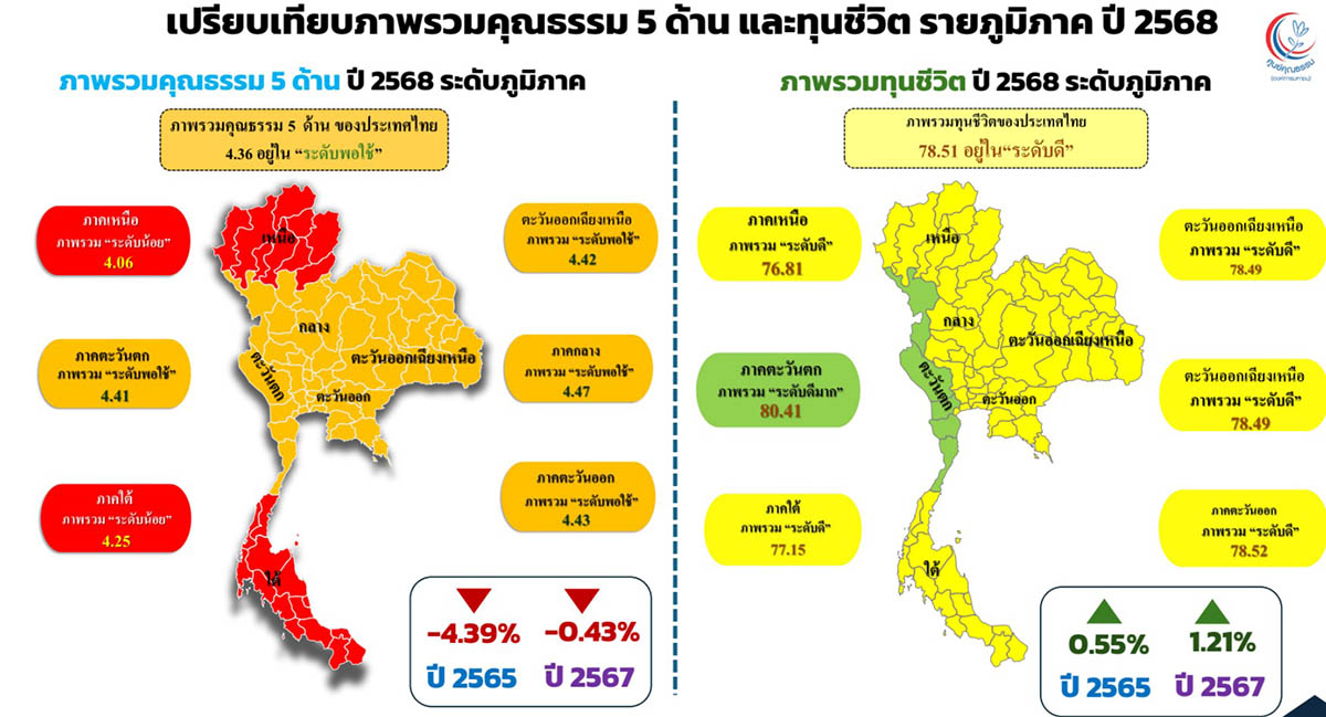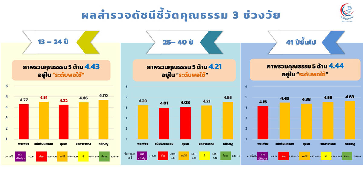 รศ.นพ.สุริยเดว ทรีปาตี ผู้อำนวยการศูนย์คุณธรรม เปิดเผยผลสำรวจว่า “ดัชนีชี้วัดคุณธรรมของคนไทยทั้ง 3 ช่วงวัย (13–24 ปี, 25–40 ปี และ 41 ปีขึ้นไป) อยู่ในระดับ “พอใช้” เฉลี่ย 4.3 คะแนน ขณะที่ดัชนีทุนชีวิตอยู่ในระดับ “ดี” โดยมีคะแนนเฉลี่ยเกือบ 79% โดยเฉพาะกลุ่มวัย 41 ปีขึ้นไปที่มี “พลังตัวตน” โดดเด่นที่สุด ส่วนในระดับภูมิภาค พบว่าภาคตะวันตกมีค่าเฉลี่ยสูงสุด อยู่ในระดับ “ดีมาก” ที่ร้อยละ 80.41 สะท้อนถึงศักยภาพทุนชีวิตที่แข็งแรงและเป็นรากฐานสำคัญ ในการกำหนดทิศทางสังคมไทยในอนาคต”