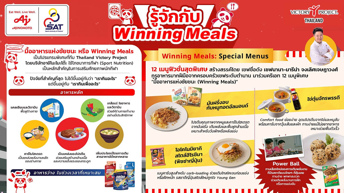 โดยมีไฮไลต์คือ 12 เมนูพิเศษ “มื้ออาหารแห่งชัยชนะ (Winning Meals)” ที่นำเมนูยอดนิยมของคนไทยมาครีเอทใหม่ตามแนวคิด ‘เรากินเพื่ออะไร?’ กับ 3 คอนเซ็ปต์โภชนาการที่ออกแบบมาเพื่อนักกีฬา ได้แก่ กินเพื่อคงสมดุล – มื้อเบา รักษาความบาลานซ์ / กินเพื่อเตรียมพร้อม – สะสมพลังงาน เตรียมซ้อม-แข่งวันต่อไป / กินเพื่อฟื้นฟู – ฟื้นฟูร่างกาย เติมพลังหลังใช้ร่างกายหนัก โดยผสานรสชาติที่คุ้นเคยกับโภชนาการอาหารเพื่อความอร่อยลงตัว