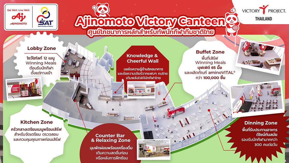 “Ajinomoto Victory Canteen” หรือศูนย์โภชนาการหลักสำหรับทัพนักกีฬาทีมชาติไทย จำนวน 230 ที่นั่ง เป็นทั้งพื้นที่รับประทานอาหารและพื้นที่ทำกิจกรรมสำหรับนักกีฬาทีมชาติไทย ออกแบบตามมาตรฐานระดับโลก เพื่อรองรับนักกีฬาได้กว่า 300 คนต่อวัน