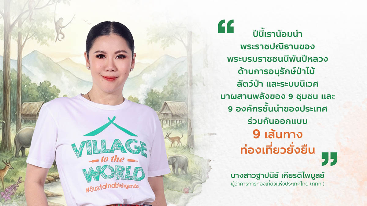 การท่องเที่ยวแห่งประเทศไทย (ททท.) เดินหน้าสานต่อ โครงการ Village to the World Season 5 #SustainableAgenda #QueenLegacy น้อมนำแนวพระราชปณิธานด้านการอนุรักษ์ทรัพยากรธรรมชาติของ สมเด็จพระนางเจ้าสิริกิติ์ พระบรมราชินีนาถ พระบรมราชชนนีพันปีหลวง มาบูรณาการกับ 9 ชุมชนท่องเที่ยวและ 9 องค์กรชั้นนำของประเทศ ร่วมวางรากฐานโมเดลการท่องเที่ยวเชิงคุณค่า ภายใต้แนวคิด Shared Value และ ESG Tourism มุ่งยกระดับระบบนิเวศการท่องเที่ยวยั่งยืน พร้อมขับเคลื่อนการสื่อสารผ่านเครือข่ายสื่อมวลชนและจัดทำข้อมูลเชิงประจักษ์ เพื่อผลักดันชุมชนไทยสู่การยอมรับในระดับสากล