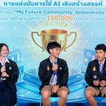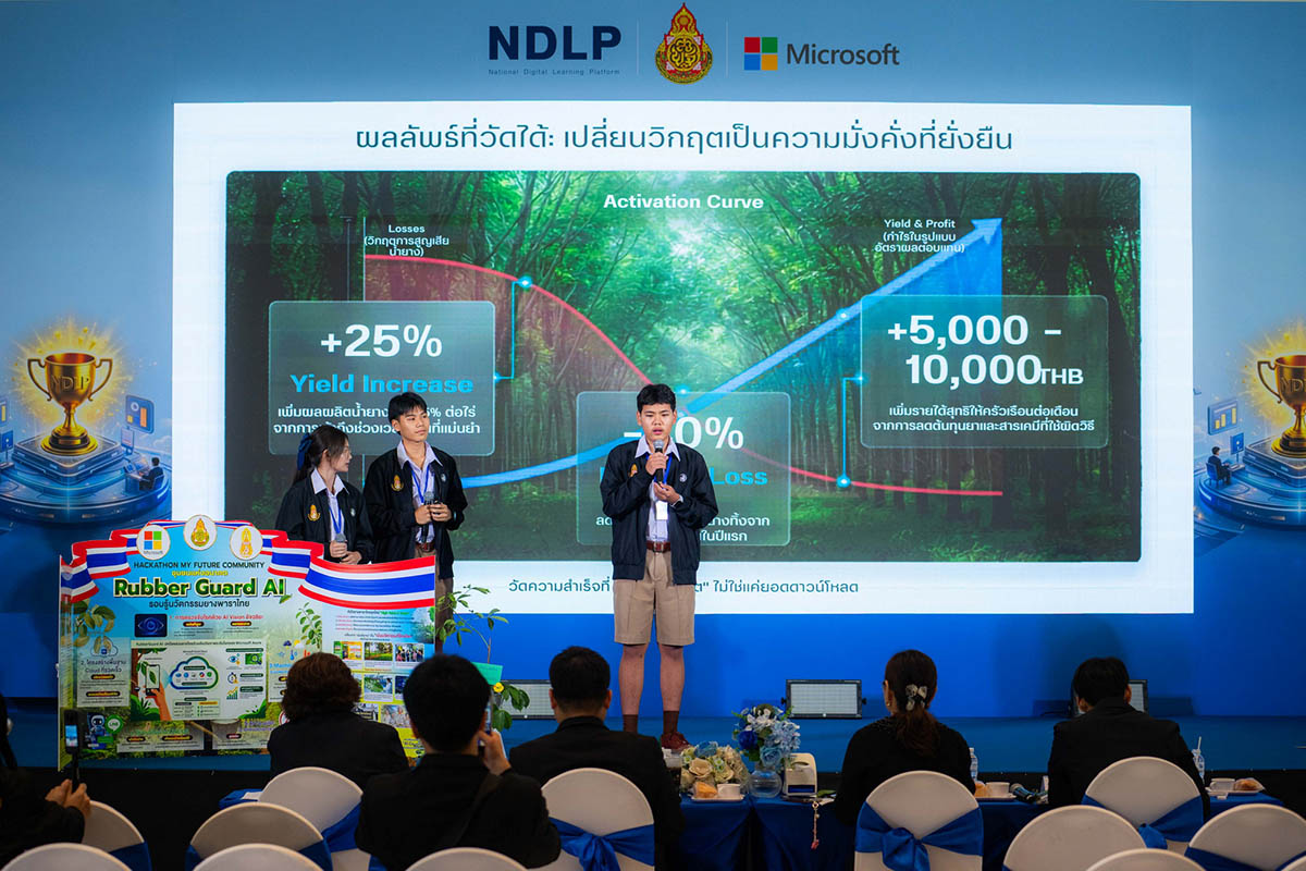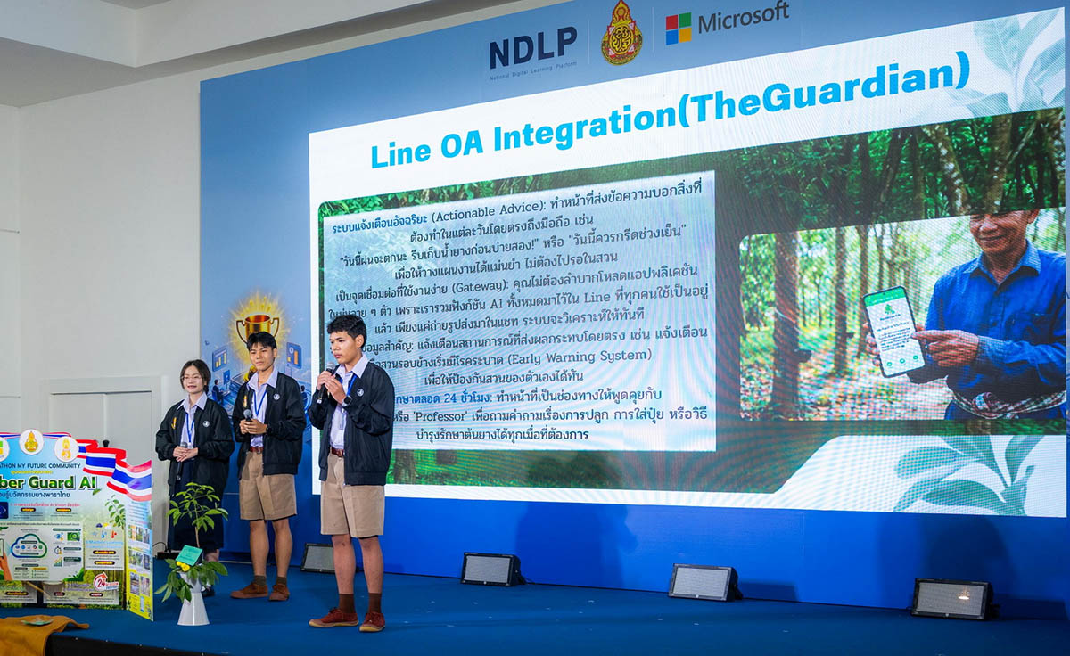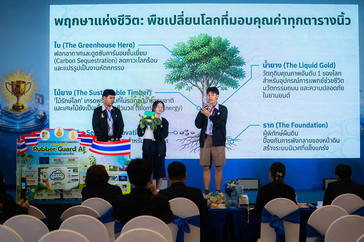 และสำหรับการแข่งขัน AI Hackathon ภายใต้หัวข้อ “My Future Community – ชุมชนแห่งอนาคต” ครั้งนี้ ผู้ชนะเลิศ ที่ได้รับเงินรางวัล 50,000 บาทพร้อมถ้วยรางวัลชนะเลิศ ได้แก่ ทีมตาสระอิสระโอ จากโรงเรียนรร.เบญจมราชูทิศจันทบุรี ภายใต้ผลงาน “RubberGuard AI” คือการสร้าง “My Future Community” สำหรับชาวสวนยางจันทบุรี โดยใช้ AI ช่วยเพิ่มผลผลิต 20-50% ลดสูญเสียจากโรคใบร่วง ลดการจ้างแรงงานแพง และป้องกันการโค่นต้นยาง