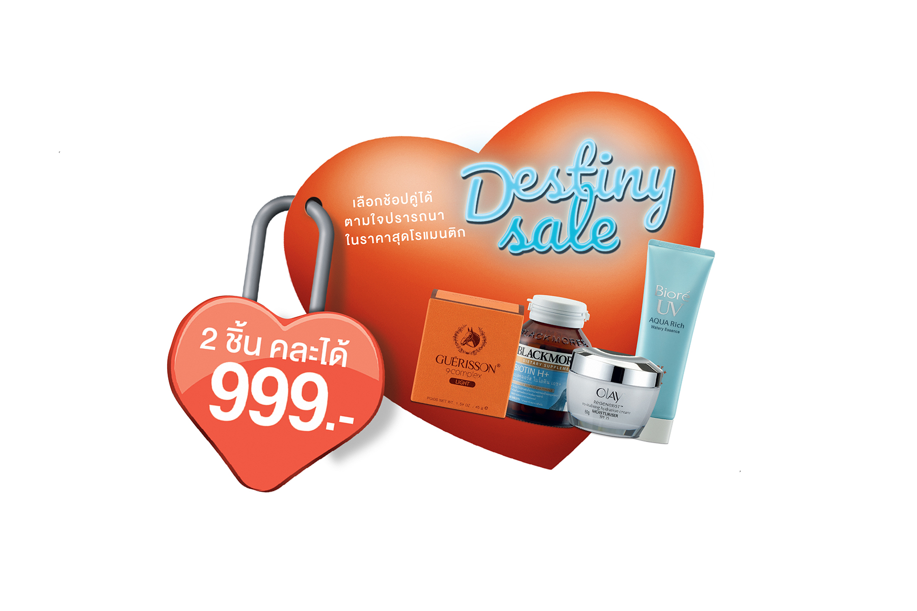 “พิเศษกว่าที่เคย กับแคมเปญสุดพิเศษ “Destiny Sale” ให้คุณจับคู่ช้อปสินค้าต่างแบรนด์ได้ตามใจปรารถนาในราคาสุดโรแมนติก โดยสามารถเลือกซื้อผลิตภัณฑ์จำนวน 2 ชิ้นจากผลิตภัณฑ์ยอดนิยมหลากหลายแบรนด์ที่เข้าร่วมโปรโมชั่น ในราคาสุดคุ้มแบบที่ไม่เคยมีที่ไหนมาก่อน เริ่มจาก 399 บาท 499 บาท 999 บาท และ 1,199 บาท และสิ้นสุดการรอคอยกับสินค้าสุดคุ้ม “ซื้อ 1 แถม 1 ฟรี” ซิกเนเจอร์โปรโมชั่นของบู๊ทส์กับสินค้ากว่า 800 รายการ ที่ล้วนถูกคัดสรรมาเป็นอย่างดีจากแบรนด์ชั้นนำของบู๊ทส์ อาทิ Soap & Glory No7 Inecto และแบรนด์ยอดนิยมอย่าง Colgate Bioderma และ Olay ให้ทุกคนได้รีบจับจองกันได้ที่ร้านบู๊ทส์ทุกสาขา ตั้งแต่วันนี้ถึงวันที่ 27 กันยายน 2560”