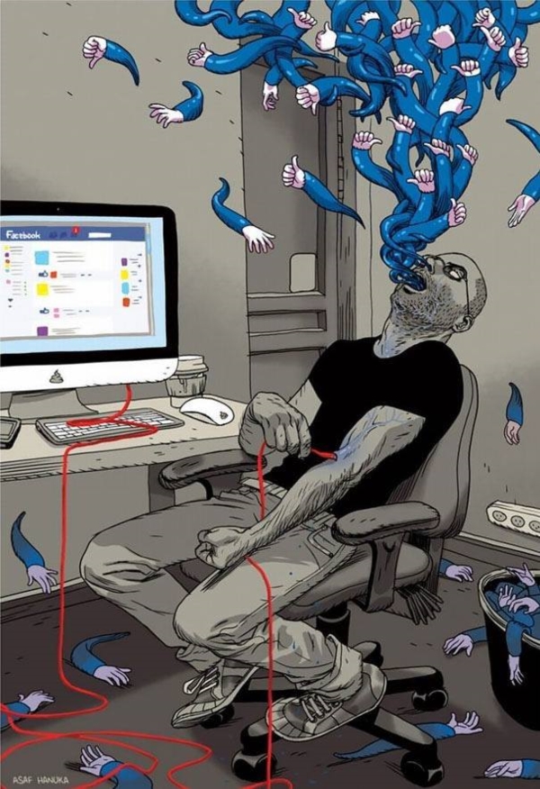 ในยุคปัจจุบันโซเชียลมีเดีย อย่าง เฟซบุ๊ก ทวิตเตอร์ ถือเป็นปัจจัยที่ 5 ในชีวิตของใครหลายๆ คน เพราะนอกจากจะไว้อัพเดทข่าวสาร พูดคุยกับเพื่อนๆ แล้ว ยังเป็นช่องทางการทำงาน การติดต่อสื่อสารของหลายๆ องค์กร ไม่ว่าจะทำงาน หรือส่งการบ้านอาจารย์ นอกจากนี้ยังเป็นเครื่องมือช่วยอำนวยความสะดวกให้ชีวิตง่ายขึ้น อาทิ สามารถสั่งอาหาร สั่งของออนไลน์ มาส่งให้ถึงที่ บางคนก็เอาไว้เล่นเกมส์ หาดูหนัง ดูซีรีส์ และอาจจะหลงลืมความพอดีไปจนกลายเป็นติดกันงอมแงม และภาพต่อไปนี้ทำออกมาเสียดสีได้เจ็บแสบสุดๆ ถึงพฤติกรรมคนที่คลั่งโซเชียลมากๆ ไม่ต้องอธิบายอะไรมาก แค่เห็นภาพก็เข้าใจ