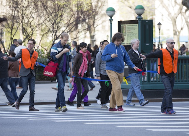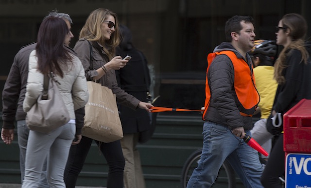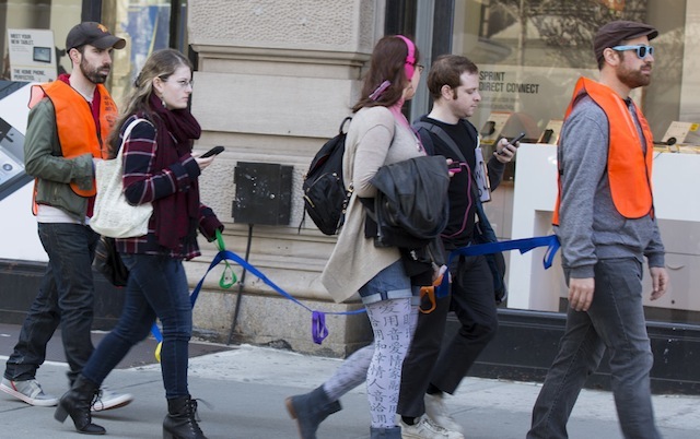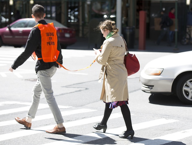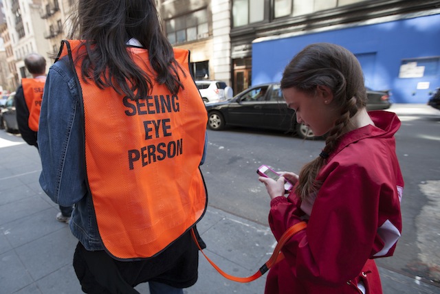 ภาพคนใส่เสื้อกั๊กสีส้ม และมีคนเดินตามหลัง โดยมีสายลากจูงคล้องใส่ข้อมือ ก้มหน้าก้มตากำลังเล่นสมาร์ทโฟน ที่เห็นในภาพต่อไปนี้นั้น ไม่ได้เป็นแคมเปญ รณรงค์ หรือภาพเสียดสีสังคมแต่อย่างใด หากแต่เป็นภาพจากเรื่องจริง ที่เกิดขึ้นใน นิวยอร์ก ซึ่งคนที่ใส่เสื้อกั๊กสีส้มนั้นเป็นบริการ ที่เกิดขึ้นใหม่ มีชื่อเรียกว่า Seeing Eye People หรือบริการคนนำทาง สำหรับผู้ที่ติดการเล่น สมาร์ทโฟน ก้มหน้าห้มตามองจอตลอด ไม่สนใจมองสิ่งรอบข้าง หรือบางคนอาจจะต้องทำงาน ติดต่อสื่อสารผ่านอุปกรณ์ประเภท Smart Device อยู่ตลอดเวลา ดังนั้นแล้ว Seeing Eye People ถือว่าเป็นตัวช่วยในการเดินได้ดีสำหรับคนกลุ่มดังกล่าวมากๆ โดยเฉพาะเวลาข้ามถนน ลดการเสี่ยงอันตรายได้เลย
