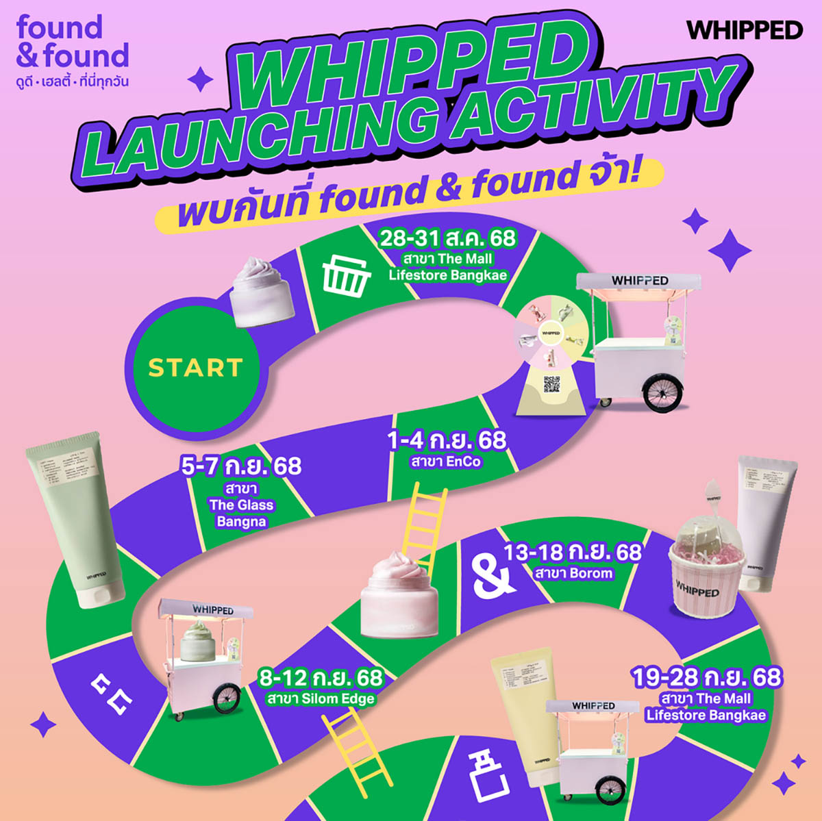 และเพื่อจุดกระแส “WHIPPED Sensation” ในเมืองไทย “found & found” จึงได้ฉลองเปิดตัวการวางจำหน่าย “WHIPPED” ที่แรกอย่างเป็นทางการ พร้อมจัดกิจกรรมสุดเอ็กซ์คลูซีฟเพื่อสาวกบิวตี้สายเกาโดยเฉพาะ โดยนำเสนอผ่านคอลเลกชัน “WHIPPED Vegan Pack Cleanser” นิยามใหม่ของการล้างหน้า ที่มองลึกไปถึงจุดเริ่มต้นของการดูแลผิวในทุกมิติ พร้อมมอบความรู้สึกดีตั้งแต่ครั้งแรกที่สัมผัส
