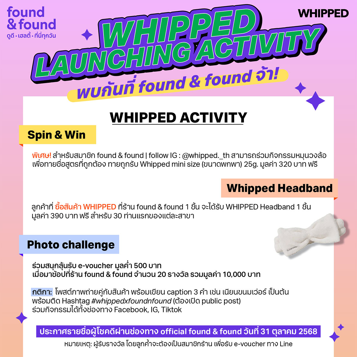 สำหรับสมาชิก found & found เมื่อชื้อสินค้า WHIPPED และโพสต์ภาพถ่ายคู่กับสินค้าลงโซเชียล ของตัวเองผ่านช่องทาง Facebook, IG, TikTok พร้อมแคปชั่น 3 คำหลังใช้ เช่น ขนมเว่อร์ อ่อนโยนน้า และติดแฮชแท็ก #whippedxfoundnfound (ต้องเป็น public post) ลุ้นรับ e-voucher มูลค่า 500 บาท จำนวน 20 รางวัล (ประกาศรายชื่อผู้โชคดีผ่านช่องทาง official found&found วันที่ 31 ตุลาคม 2568)
