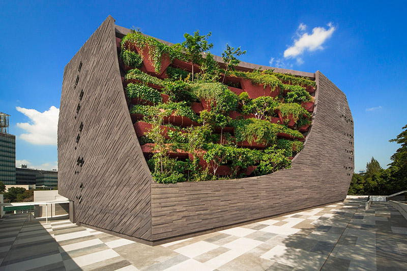 จุดมุ่งหมายสูงสุดของ มหาวิทยาลัย Nanyang Technological University คือการเป็นมหาวิทยาลัยที่เป็นมิตรกับสิ่งแวดล้อมมากที่สุดในโลก ด้วยแนวคิดการใช้ทรัพยากรอย่างมีประสิทธิภาพ พร้อมทั้งลดการใช้พลังงานและน้ำอย่างสิ้นเปลือง ตึกคณะ School of Art, Design and Media นั้น ถือเป็นตัวอย่างที่น่าสนใจ ด้วยการสร้างงานศิลปะชั้นเลิศจากหลังคาของตึกที่ลาดชันพาดผ่านสามอาคาร และปกคลุมด้วยสนามหญ้าที่เชื่อมต่อลงมาถึงพื้นดินด้านล่าง นอกจากจะสร้างสีเขียวสบายตาปกคลุมทั่วบริเวณ ผู้คนยังสามารถใช้ประโยชน์เป็นพื้นที่สาธารณะในการทำกิจกรรมต่างๆได้ นอกจากนี้ พื้นที่บนดาดฟ้ายังปกคลุมด้วยต้นไม้จำนวนมาก ที่ช่วยลดความร้อนให้กับตัวอาคารได้อีกด้วย