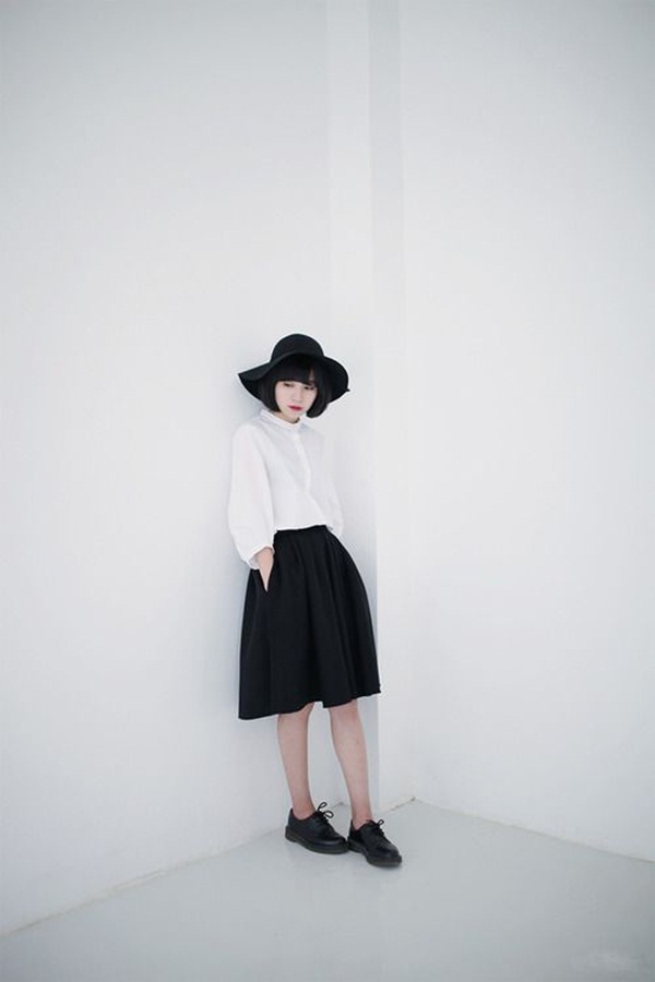 มินิมอลลุค เชิ้ตสีขาวคอจีน กระโปรงบานทรงสุ่ม หมวกใบใหญ่ๆ สักใบ ดูดีพูดเลย