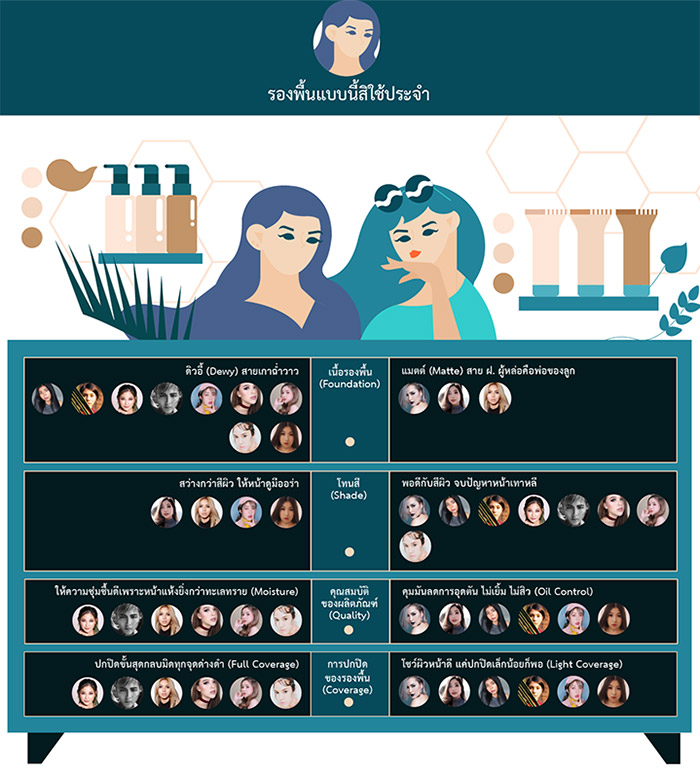 ถ้าหากพูดถึงการลงรองพื้น บิวตี้บล็อกเกอร์ 9 จาก 12 คนเลือกใช้รองพื้นแนวเกาหลี หรือแบบที่เสริมให้ผิวดูชุ่มชื้นแลดูสุขภาพดีขึ้น จะมีเพียง 3 คนเท่านั้นที่ชอบรองพื้นเนื้อแมตต์ อาจเป็นเพราะ 3 คนดังกล่าวมีประเภทผิวต่างจากอีก 9 คนที่เลือกแบบดิวอี้นั่นเอง