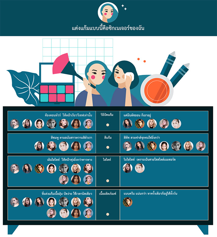 มีเพียง 2 คน ที่ยังคงคอนเซ็ปต์คิ้วคือมงกุฎของใบหน้า (tuniez83, JellyJune) และอีก 2 คน ที่เลือกพกมาสคาร่าไว้ปัดให้ขนตาสะพรึงกลมโตมากกว่า (Me.Melissa, Fah Sarika)