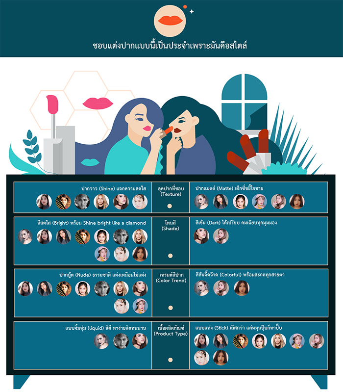 บล็อกเกอร์ส่วนใหญ่ ต้องมีเครื่องสำอางชิ้นเด็ดอย่างลิปสติกติดตัวไว้เพิ่มความมั่นใจ ทั้งยังช่วยเติมสีสันระหว่างวันให้ดูไม่ป่วยได้ ( 7 คน: Aremakeup, Licktga, Bryan Tan, Zomticha make over, Nuttyploy, Nuttyploy)