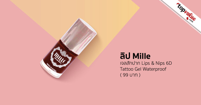 Mille เจลสักปาก Lips & Nips 6D Tattoo Gel Waterproof เป็นนวัตกรรมเจลสักปากมาในรูปแบบเจลทินท์ (Gel Tint) สะดวก ง่ายต่อการใช้งาน แห้งเร็ว และติดทนยาวนานเป็นสัปดาห์ กันน้ำกันเหงื่อ ไร้กังวลว่าสีปากจะเลือนหายไประหว่างวัน เจ้าลิปสักปาก PVA (Polyvinyl alcohol) และ PVP ที่ทำหน้าที่เสมือนฟิล์มบางๆ เคลือบริมฝีปากให้มีเฉดสีสวยโดดเด่นเป็นธรรมชาติ โดยไม่ต้องพึ่งการสักสีที่ต้องเจ็บตัวอีกต่อไป นอกจากนี้เจ้าขอดจิ๋วนี้ยังใช้ทาบริเวณหน้าอกได้ด้วยเด้อ 2 in 1 มั้ยละค้า