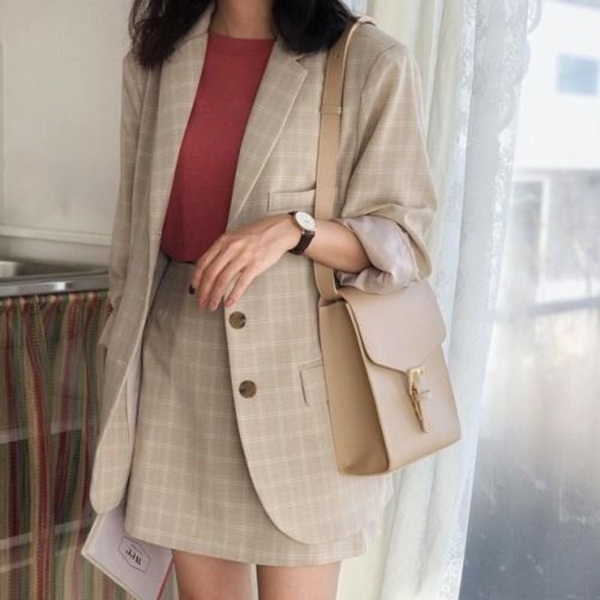 เสื้อตัวในสีแดงเลือดหมู จับแมทช์กับเบลเซอร์และกระโปรงสีน้ำตาลสวยเก๋