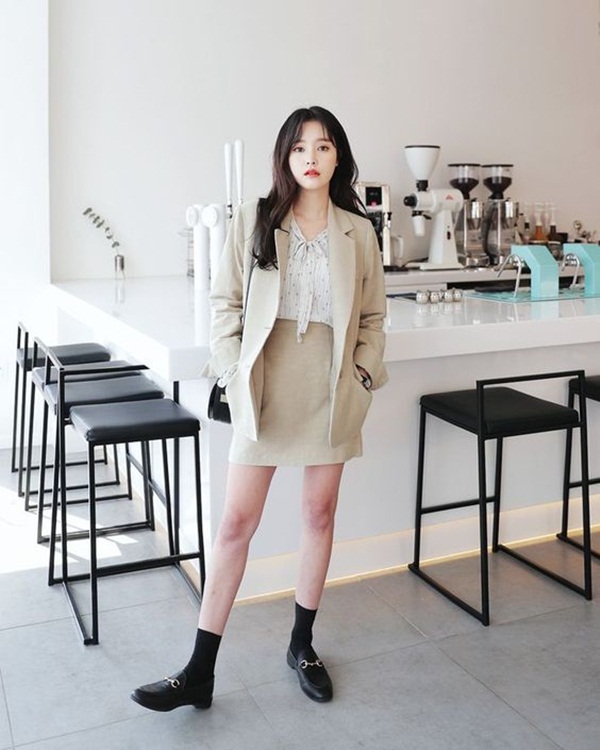 เสื้อเบลเซอร์สีครีม แมทช์กับเสื้่อตัวในเป๋นผ้าชีฟองลายดอกเล็กๆ เพิ่มความชิคด้วยรองเท้าหนังสีดำ และถุงเท้าดึงขึ้นมาสูง