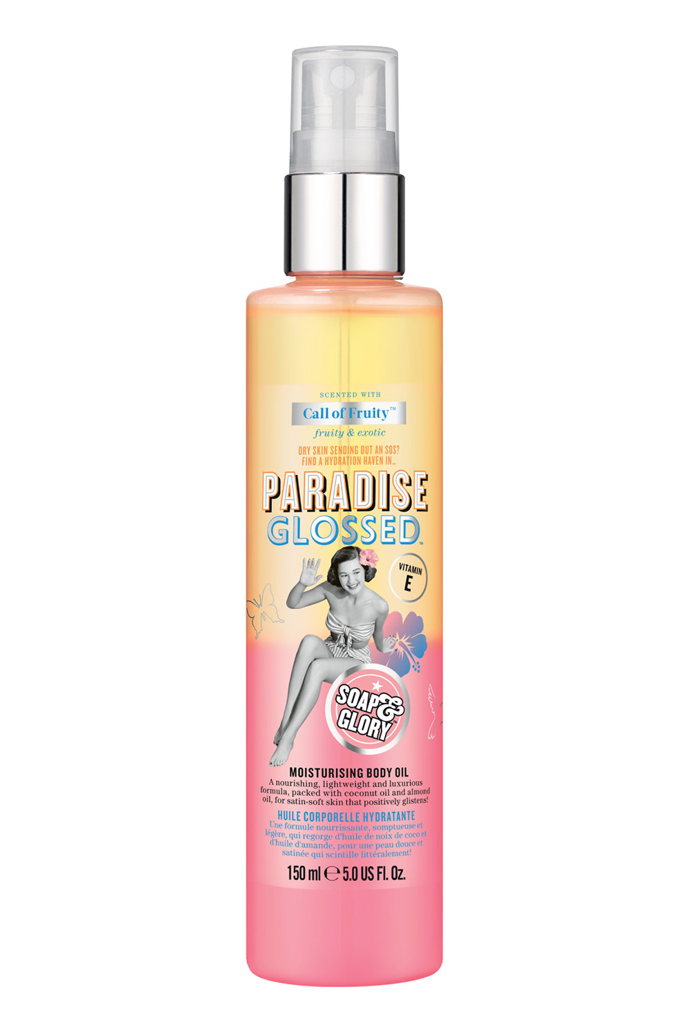 (Soap and Glory Call of Fruity Paradise Glossed Moisturising Body Oil) ผลิตภัณฑ์บำรุงผิวกาย บำรุงผิวให้ชุ่มชื้นด้วยออยล์เนื้อเบาบาง ผสานสารสกัดจากน้ำมันมะพร้าว น้ำมันอัลมอนด์ ให้ผิวเนียนนุ่มดุจกำมะหยี่