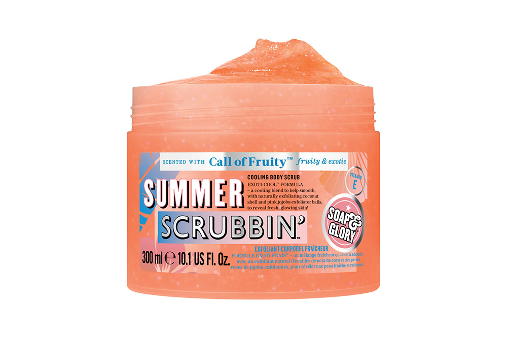 (Soap and Glory Call of Fruity Summer Scrubbin’ Cooling Body Scrub) ผลิตภัณฑ์ขัดผิวกายเนื้อเนียนละเอียด ช่วยผลัดเซลล์ผิวที่ตายแล้วเผยผิวใหม่ที่เนียนนุ่มด้วยสูตร exotic-cool ช่วยให้ผิวรู้สึกเย็นสดชื่น พร้อมส่วนผสมจากธรรมชาติ ด้วยผงขัดผิวจากเปลือกมะพร้าวและเม็ดสครับสีชมพูที่มีส่วนผสมจากโจโจบา เอสเทอร์ เผยผิวให้แลดูสุขภาพดีและเปล่งปลั่ง