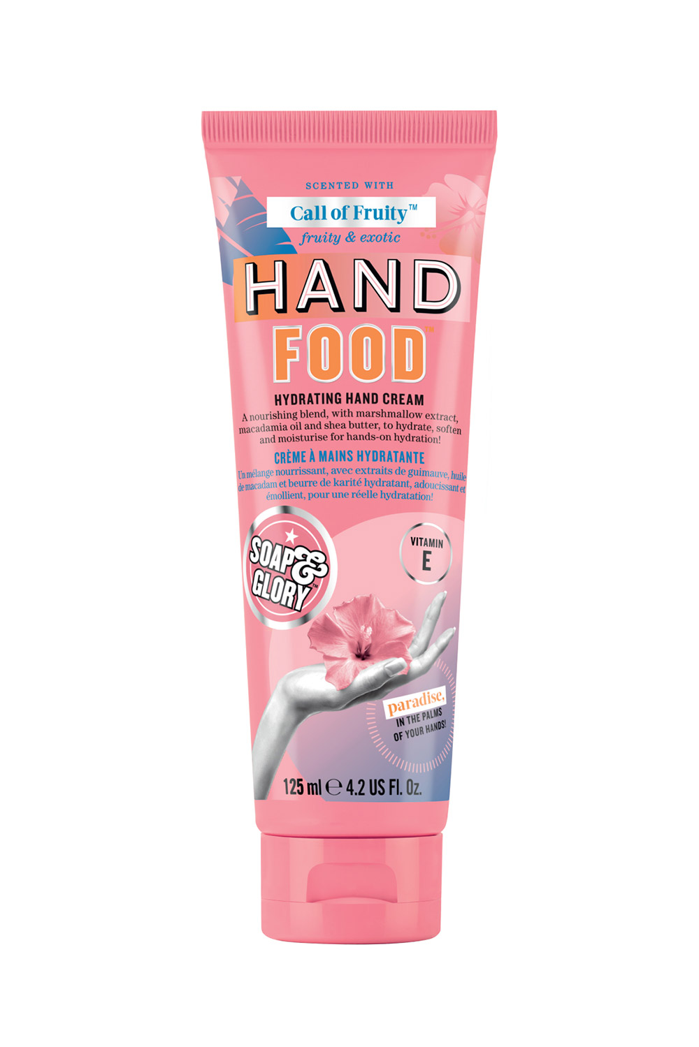 (Soap and Glory Call of Fruity Hand Food Hydrating Hand Cream) ผลิตภัณฑ์บำรุงผิวมือ ป้องกันความแห้งกร้าน ช่วยบำรุงให้ผิวมือเนียนนุ่ม ดูเรียบเนียน ด้วยสารสกัดจากรากมาชเมลโล น้ำมันแมคคาเดเมีย เชียบัทเทอร์ และวิตามินอี พร้อมกลิ่นหอมหวานน่าหลงใหล