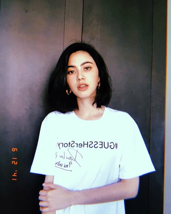 ผมสั้นบ๊อบสีดำแสกกลาง เสื้อเอวลอยคอวีสีขาว และต่างหูสีทอง