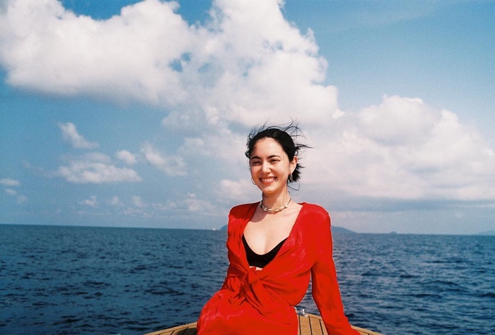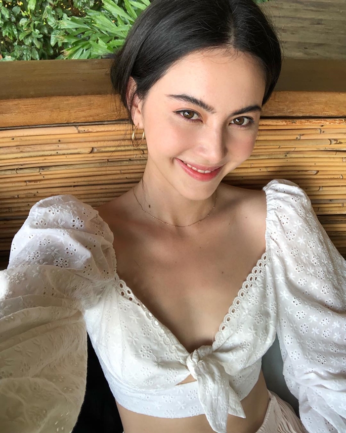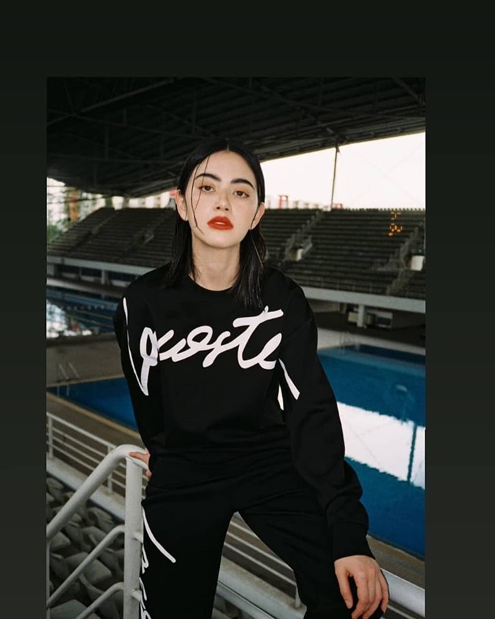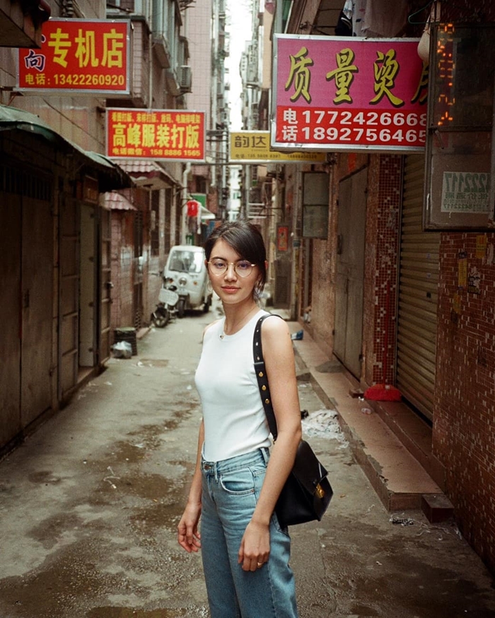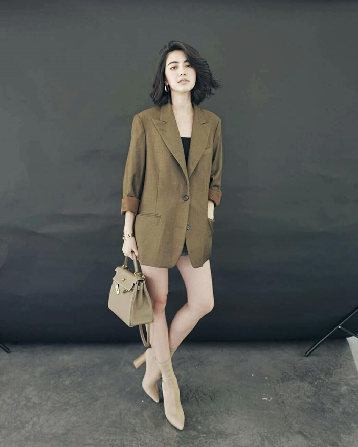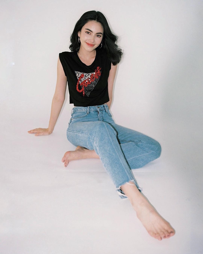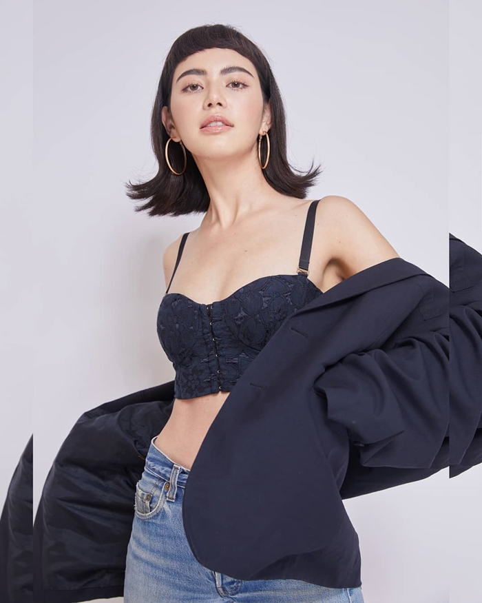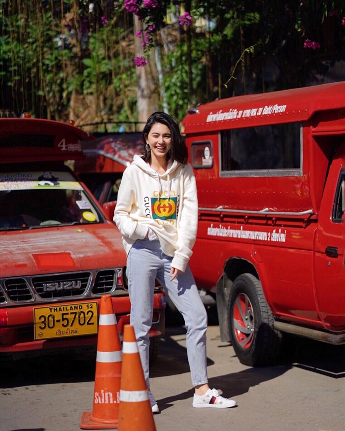 เสื้อแขนยาวครึ่งตัว แมทช์กับยีนส์ และเข็มขัดหนังสีดำ Gucci หัวเข็มขัดเป็นโลโก้ GG ที่เป็นเอกลักษณ์ของแบรนด์ ที่ขาดไม่ได้อีกอย่างคือไอเท็มต่างหูห่วงสีทอง เรียบ ๆ แต่ดูดีมีอะไร