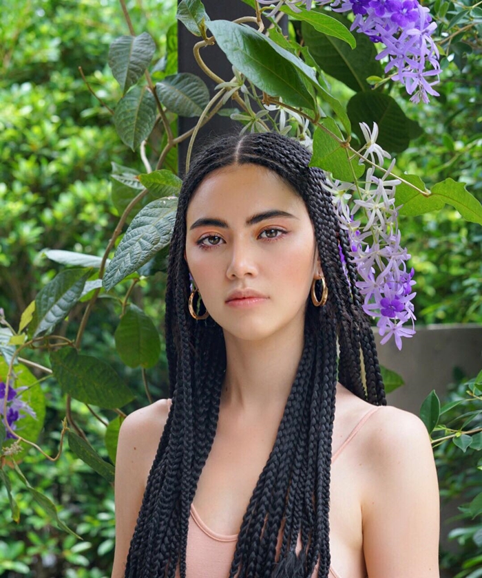 ผมประบ่าสีดำม้วนลอนปลายผมงุ้มเข้าพอง ๆ ขับกับสีผิวโทนเหลือง และต่างหู สร้อยคอสีทองเป็นที่สุด