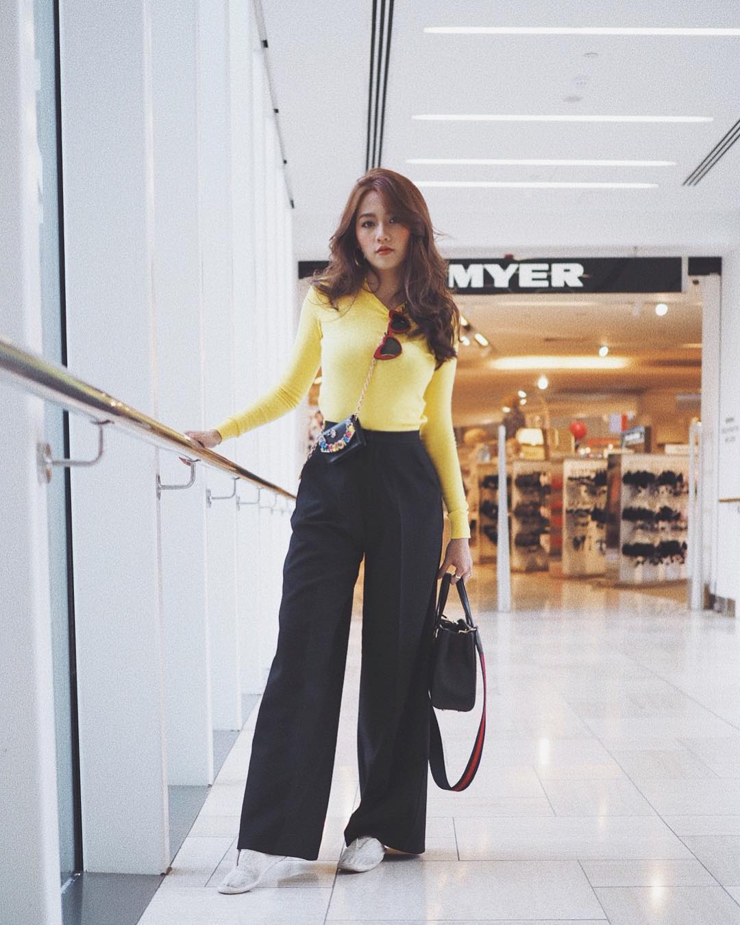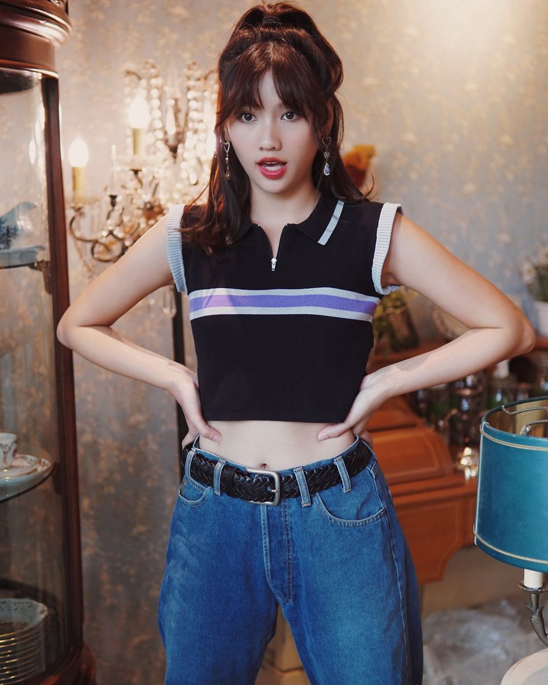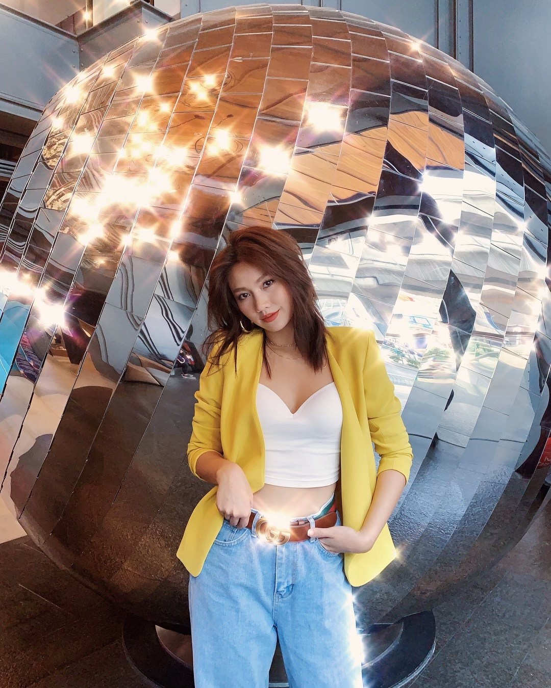 เบลเซอร์สีเหลืองมะนาว แมทช์กับเกาะอกสีขาวเอวลอย ชิคมากเมื่อใส่คู่กับยีนส์สีซีดเอวสูง