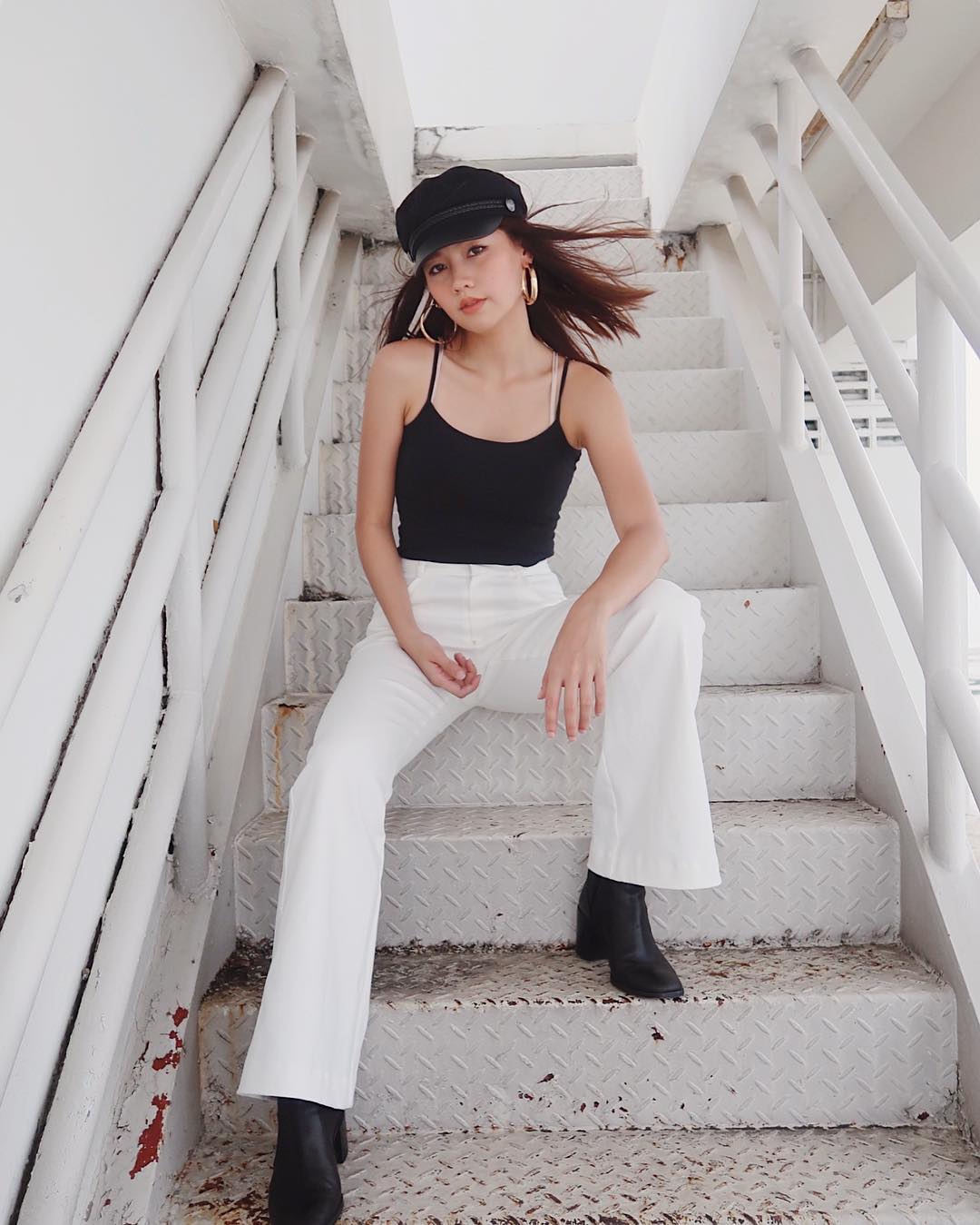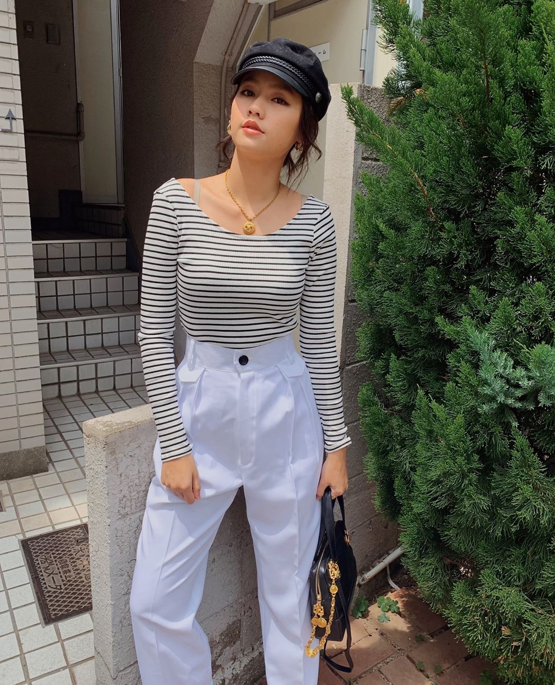 เสื้อแขนยาวลายขวางสีขาวดำ แมทช์กับกางเกงเอวสูงสีขาว หมวกเก๋ ๆ และสร้อยคอสีทอง