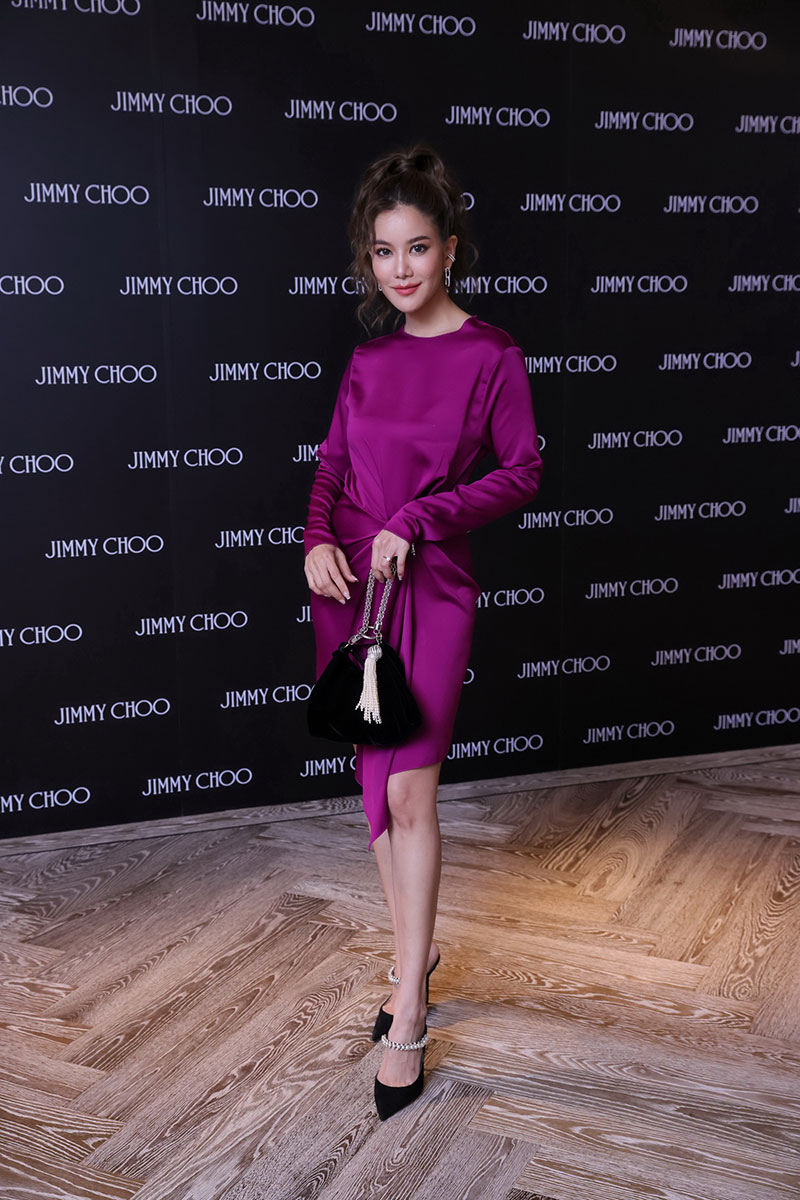 สวยโก้สไตล์สาวมั่นต้องลุคของ ก้อย – รัชวิน วงศ์วิริยะ มาในเดรสสั้นแขนยาวสีม่วง Mulberry เติมเต็มความน่าค้นหาด้วย Iconic shoes ของ Jimmy Choo รุ่น BING รองเท้าส้นเข็มดีไซน์โมเดิร์นหรูหรา โดดเด่นด้วยสายรัดคริสตัลประดับมุก ตัดกับหนังกลับสีดำ แมทช์กับคลัตช์กำมะหยี่ รุ่น CALLIE คลัตช์มัลติฟังก์ชั่นที่สามารถถือเป็นคลัตช์หรือคล้องแขนด้วยสายโซ่ สะดุดตาด้วยการประดับพู่มุกซึ่งดึงเสน่ห์ของผู้หญิงให้น่าหลงใหลมากยิ่งขึ้น