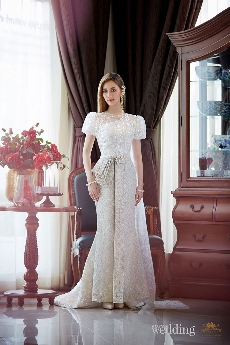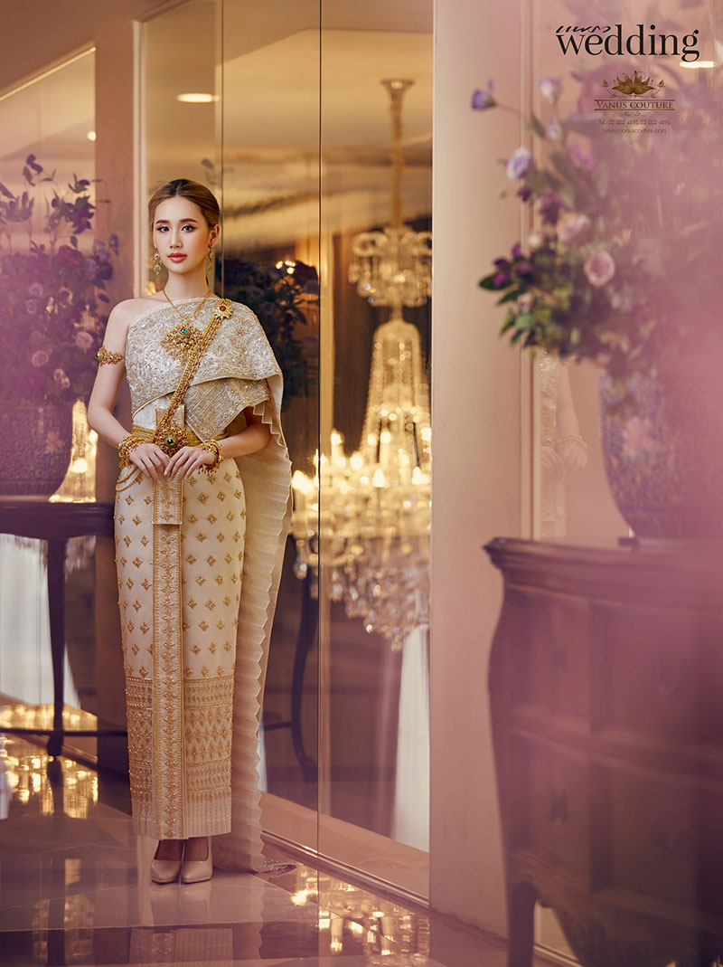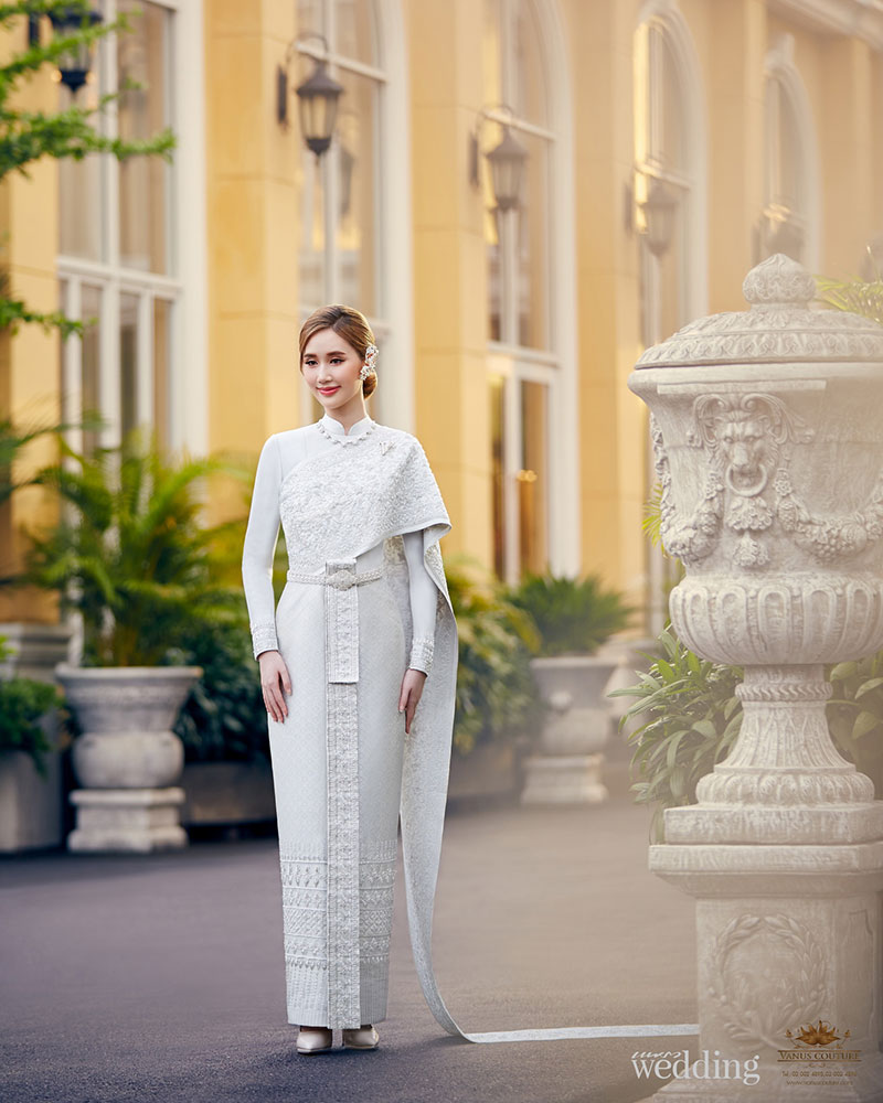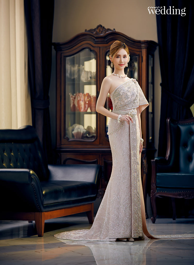 สาวยุคใหม่ที่ชื่นชอบสไตล์มิกซ์แอนด์แมทช์ เรียบหรู ดูแพง แต่ยังคงความเป็นไทยเอาไว้ได้อย่างเนียนกริบ ขอแนะนำ ชุดไทยประยุกต์ ชุดนี้เลย บอกได้คำเดียวว่าตอบโจทย์คุณสาว ๆ สุด ๆ ตัวเสื้อถูกออกแบบเป็น เสื้อลูกไม้แขนตุ๊กตา เพิ่มดีเทลด้วยลวดลายงานปักคริสตัล และ ลูกปัดผลึกแก้วใส ลงบนผ้าซีทรูซีขาวออฟไวท์ทั้งตัว เพื่อความอ่อนช้อยสวยงาม ตัดกับตัวกระโปรงทรงหางปลาลากยาวที่ตัดเย็บจาก ผ้าไหมพาราณสี ที่ผ่านการทออย่างประณีต แต่ยังคงอัตลักษณ์แบบชุดไทยไว้ด้วยหน้านางและชายพก แม้ชุดนี้จะมีดีเทลไม่มาก แต่เสริมลุคให้ผู้สวมใส่ดูงามระหงส์ บริสุทธิ์ผุดผาดละม้ายคล้ายเด็กวัยแรกรุ่นที่น่าจับตามองอย่างยิ่ง