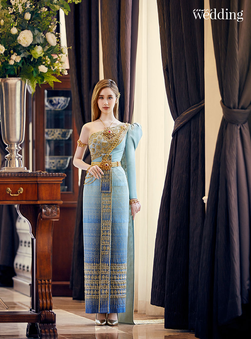 เปิดตัวด้วยชุดไทยที่สาวสายฝอสายแฟห้ามพลาดเด็ดขาด บอกแล้วว่า ห้องเสื้อ วนัช กูตูร์ เสกชุดไทยออกมาแต่ละชุดสวยฟาดสุดๆ ไปเลย แถมยืนหนึ่งของจริงไม่มีโป๊ะอีกด้วย ชุดนี้ถือเป็นชุดไฮไลท์ ที่ดัดแปลงมาจากชุดไทยจักรีที่ทัชใจสาวๆ ยุคนี้มากทีเดียว ด้วยงานดีไซน์ที่ถูกวางไว้ไม่ให้ไทยจ๋ามาก ตัวชุดตัดเย็บด้วย ผ้าไหมลำพูนสีฟ้าพาสเทลยกล้านนา แบบสั่งทอพิเศษ รวมถึงใช้เทคนิคพิเศษ ในการย้อมไล่สีผ้าแบบออมเบร มีการจับเดรปตรงตัวเสื้อ ทับด้วยสะพักเฉียงบ่าที่บรรจงปักด้วยลูกปัดและคริสตัลสีทอง ตัวสไบปักเป็นลวดลายแห่งวนัช (แปลว่า ดอกบัว) จรดทอดยาวถึงพื้น