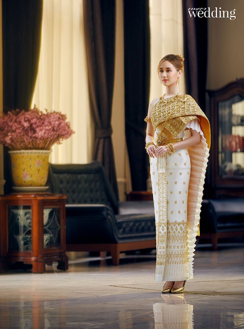 ถ้าสาว ๆ คนไหนชื่นชอบชุดไทยจักรพรรดิ ที่เน้นงานประณีต งดงาม และดูเลอค่า ห้ามพลาดชุดนี้เด็ดขาด ตัวชุดไทยตัดเย็บด้วยผ้าไหมลำพูนสีขาวเกรดพรีเมียม เพิ่มความหรูหราสะดุดตา ด้วยลวดลายของงานปักลูกปัดสีทองและคริสตัล ห่มด้วยสไบจีบสีขาวทับด้วยสะพักโบราณสีทอง ปักด้วยดิ้นทองลายดอกพุด และประดับด้วยคริสตัลทั่วทั้งผืนอีกชั้น เพิ่มความเก๋ที่ชายสไบด้วยภู่ทองที่ร้อยเรียงด้วยลูกปัดสุดงามตา นับเป็นอีกหนึ่งชุดไทยจักรพรรดิที่ได้รับเสียงชื่นชมอย่างมากในเวลานี้