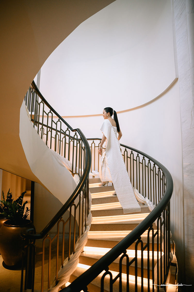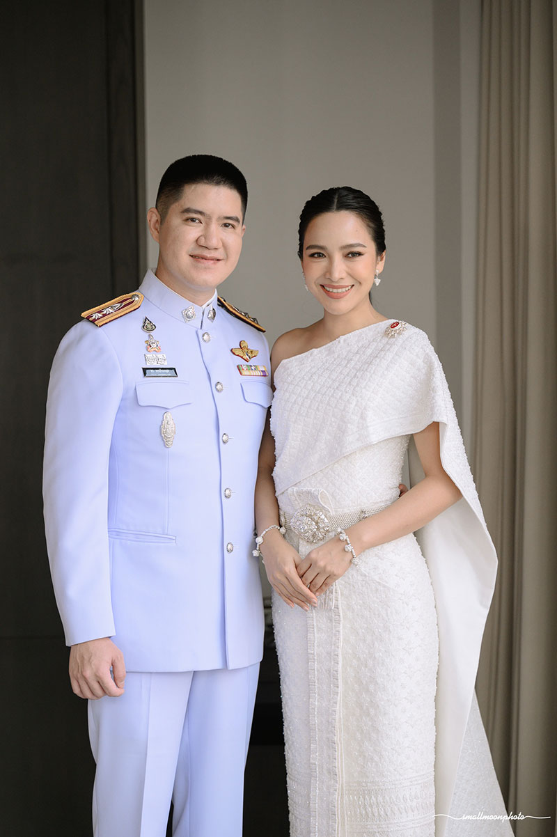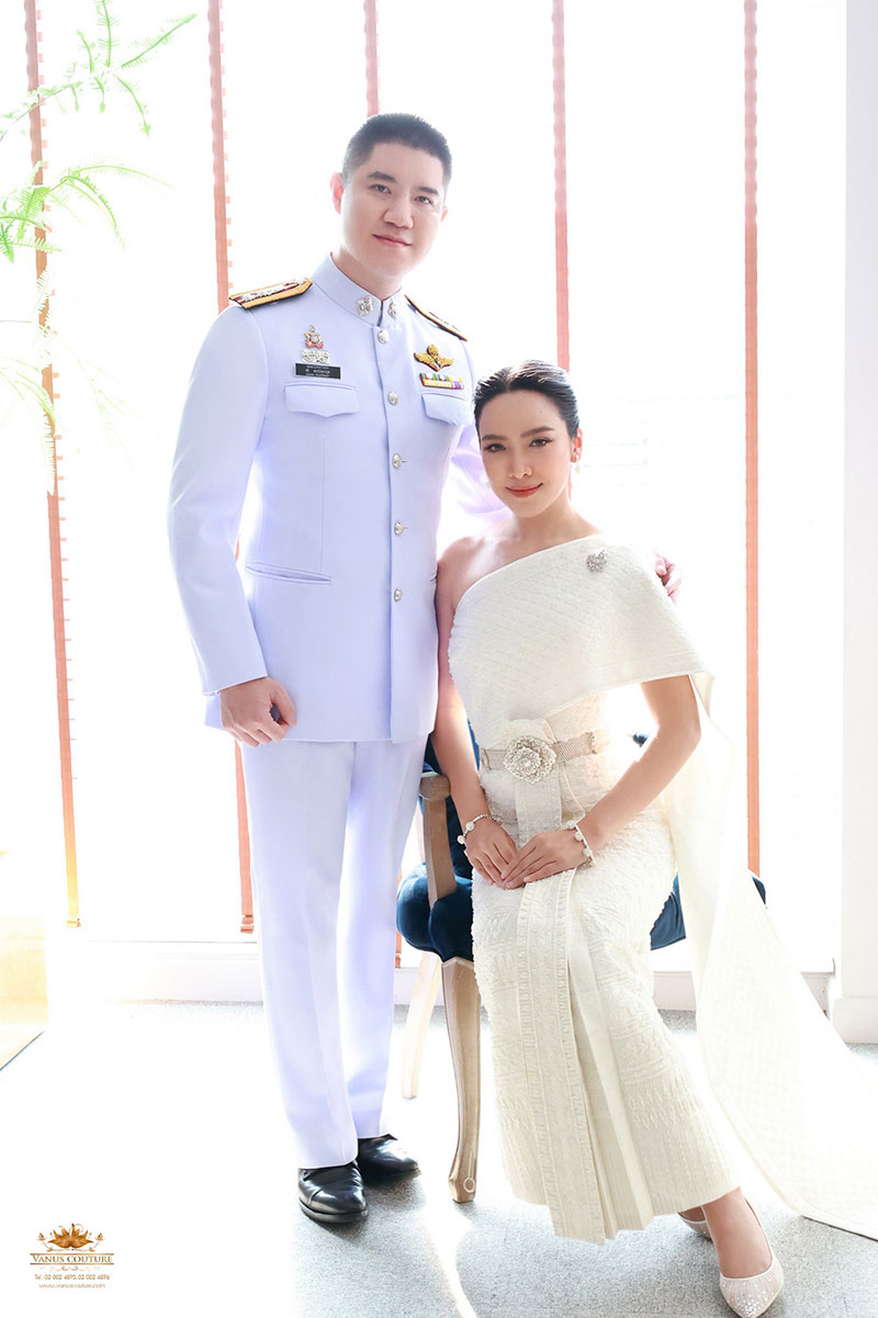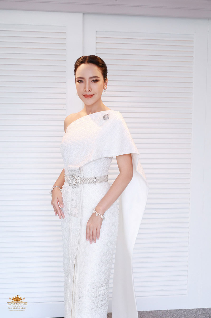 เมื่อเข้าสู่พิธีหมั้น เจ้าสาวปรากฎตัวในลุคชุดไทยจักรีโทนสีขาวดอกแก้ว ที่เรียกเสียงชื่นชมจากผู้ที่มาร่วมงานมากมายเพราะถือเป็นอีกหนึ่งชุดเจ้าสาว ที่สวยสง่างามและน่าจับตามองมาก ๆ ในปีนี้ ซึ่งเป็นผลงานการออกแบบจากดีไซน์เนอร์มือทอง สรรค์ สุดเกตุ เจ้าของห้องเสื้อชื่อดังย่านลาดพร้าว วนัช กูตูร์ และเจ้าสาวเองก็ได้มีส่วนร่วมในการออกแบบชุดในครั้งนี้ด้วย