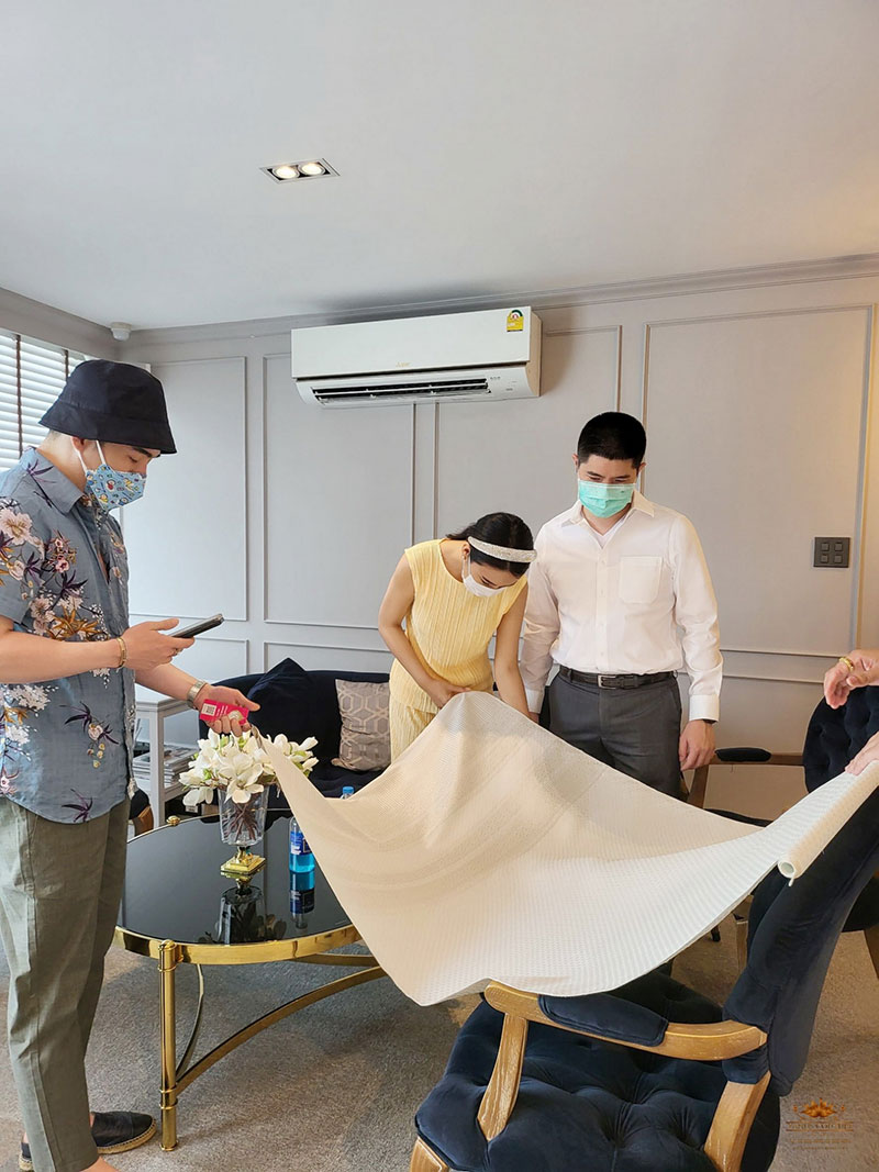 ความพิเศษของชุดไทยจักรีชุดนี้ อยู่ตรงผ้าไหมลำพูนผืนงาม ที่ผ่านการทอมือขึ้นมาใหม่ทั้งผืน ที่มีลวดลายวิจิตรบรรจงงดงาม เป็นพิเศษ ที่ออกแบบขึ้นมาเพื่อสำหรับสาวมะปรางโดยเฉพาะ และยังได้ขึ้นทะเบียนรับ ตรานกยูงพระราชทานจากกรมหม่อนไหม เพื่อเสริมความเป็นสิริมงคลก่อนนำมาตัดเย็บอีกด้วย โดยมีการตั้งชื่อผ้าไหมนี้ว่า “วชรต์” ซึ่งถอดมาจากชื่อของเจ้าบ่าวและเจ้าสาวนั่นเอง (ความหมายของ “วชร” หมายถึง เพชร ซึ่งสอดคล้องกับธุรกิจที่เจ้าบ่าวได้ทำอยู่)