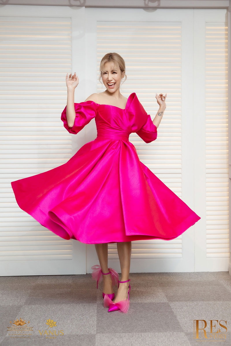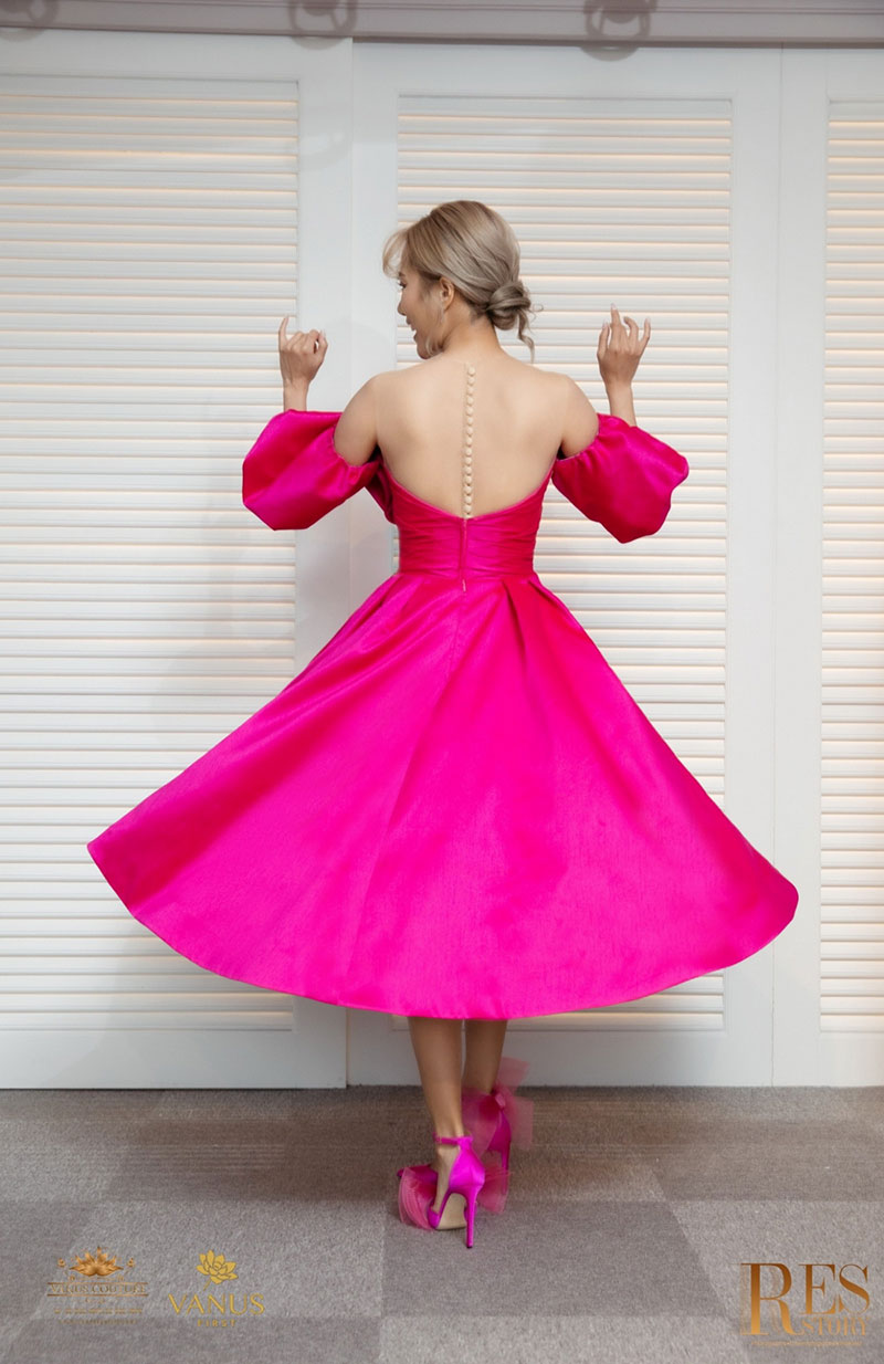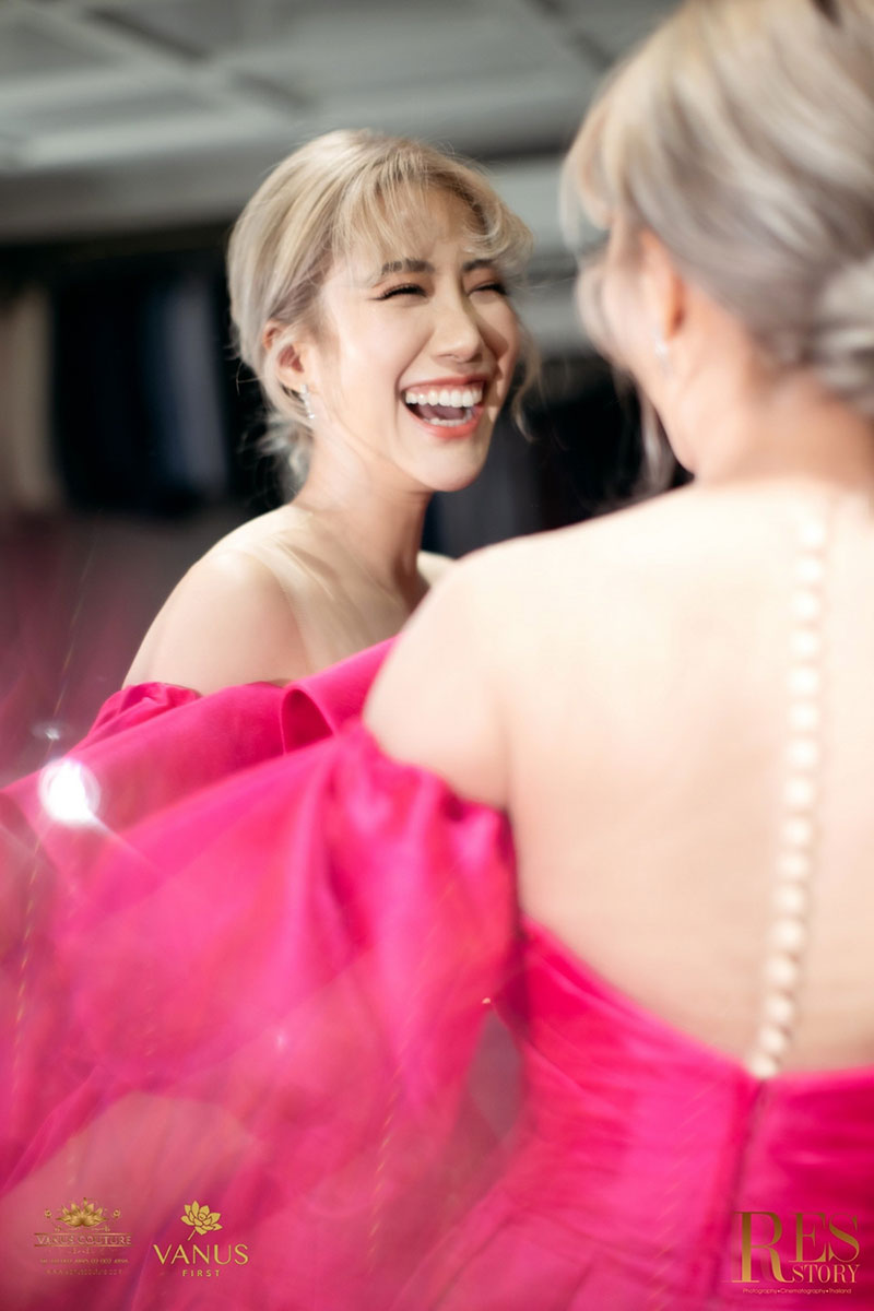 ส่วนในช่วงพิธียกน้ำชาช่วงสายนั้น เจ้าสาวมาในลุคชุดยกน้ำชาสีชมพูช็อคกิ้งพิ้ง ที่ได้แรงบันดาลใจมาจากเจ้าหญิงดิสนีย์ ที่มีความงดงามแต่แฝงไปด้วยความสนุกสนาน ความรื่นเริงเปี่ยมไปด้วยความสุขและความปิติ ชุดนี้ออกแบบมาให้เป็นชุดเดรสสั้นแขนขนมเค้ก ตัดเย็บด้วยผ้าไหมสีชมพูช็อคกิ้งพิ้ง มีความสวยเก๋และเซ็กซี่เบาๆ เป็นอีกหนึ่งลุคคูลๆที่ดูสดใสและแสดงถึงความเป็นตัวตนของเจ้าสาวออกมาได้อย่างสวยงามมากๆ