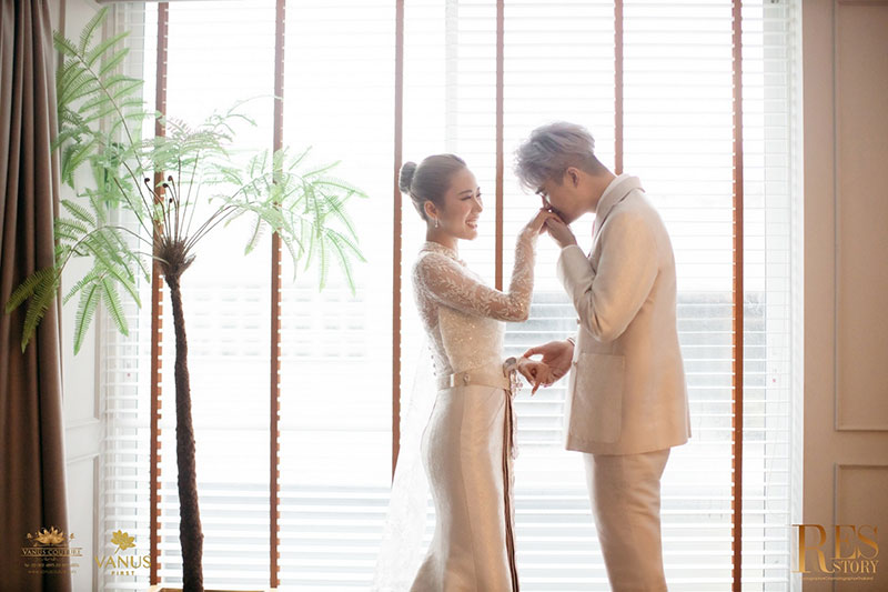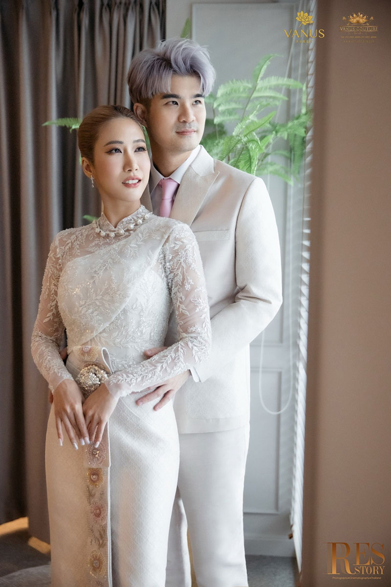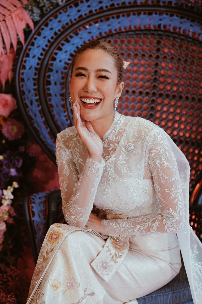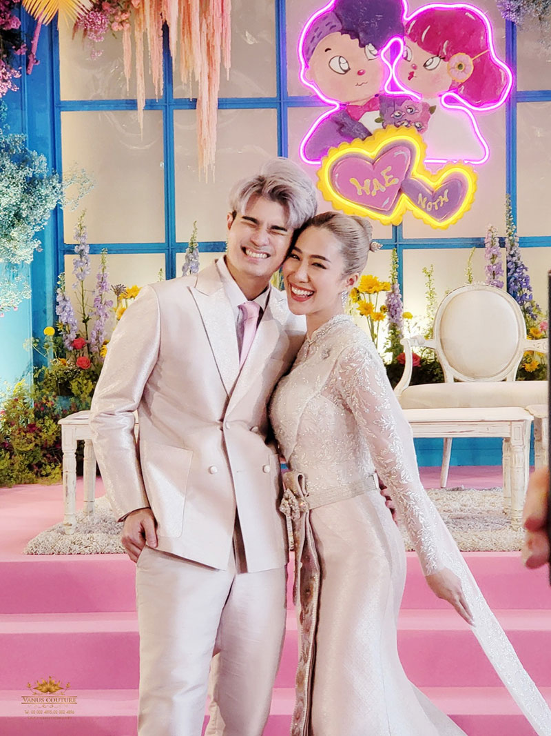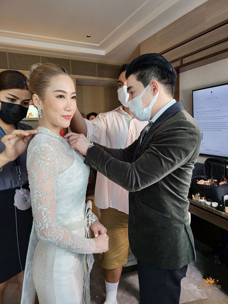 โดยทีมงานของทางห้องเสื้อได้นำลวดลายมาใส่สีใหม่ และมีงานปักแบบไทยโบราณ นำมาจัดวางที่ตัวกระโปรงของเจ้าสาว เป็นความงดงามที่มีลายเซ็นเฉพาะแบบ และยังไม่เคยเห็นจากที่ไหนมาก่อน เสริมลุคให้ดูหรูหรามากขึ้น ด้วยการประดับด้วยเข็มขัดงานศิลปะโบราณจากครูช่างศิลปาชีพฯ (อ.ไพโรจน์ สืบสาน) ต่างหูเพชรและเข็มกลัดเพชรจาก Prima Gold (สัญลักษณ์เลข๑ ที่เป็นสมบัติตกทอดจากตระกูลเจ้าบ่าวเจ้าของแบรนด์ พรีม่าโกลด์) ร้อยเรียงกันจนเรียกได้ว่าเป็นผลงานศิลปะชิ้นเอก ที่เกิดจากความเป็นตัวตนของทั้งคู่จริงๆ