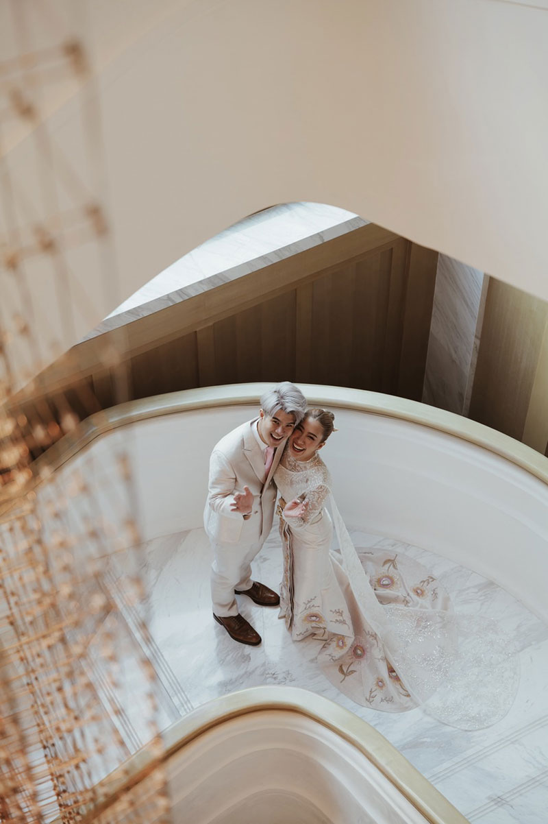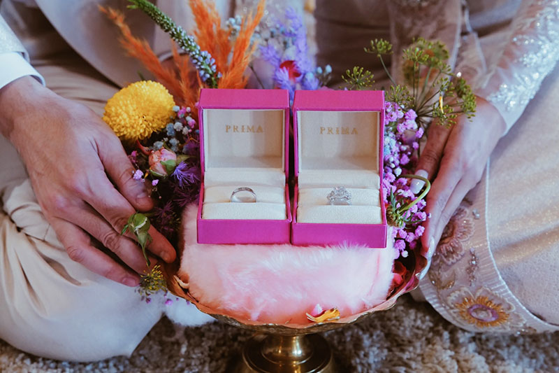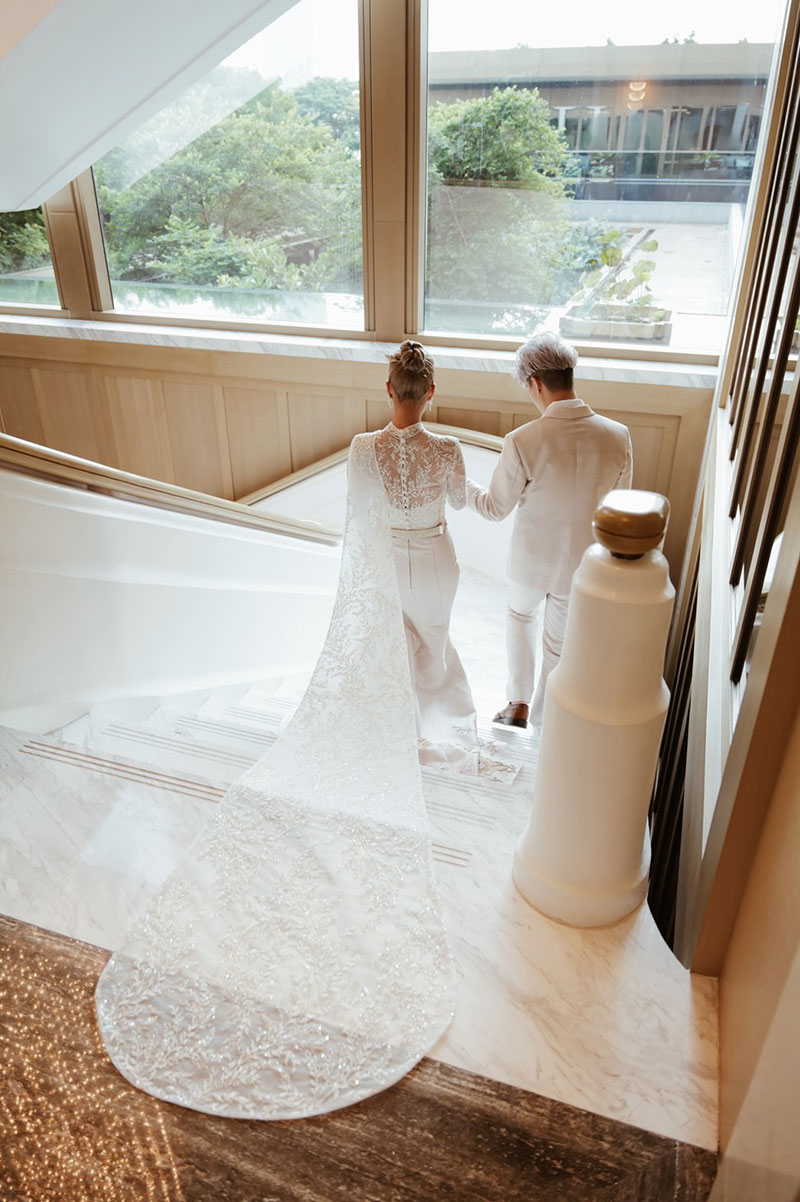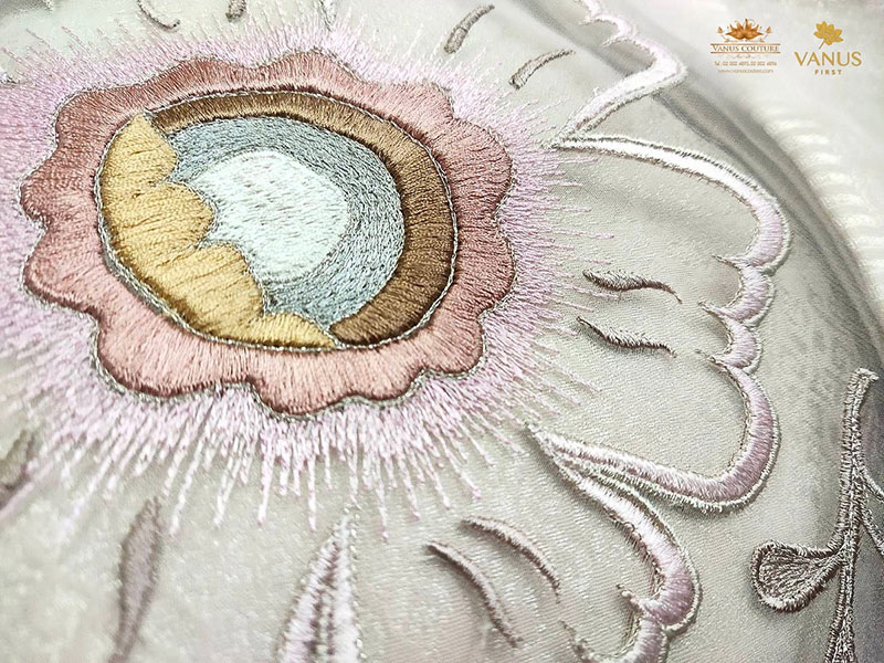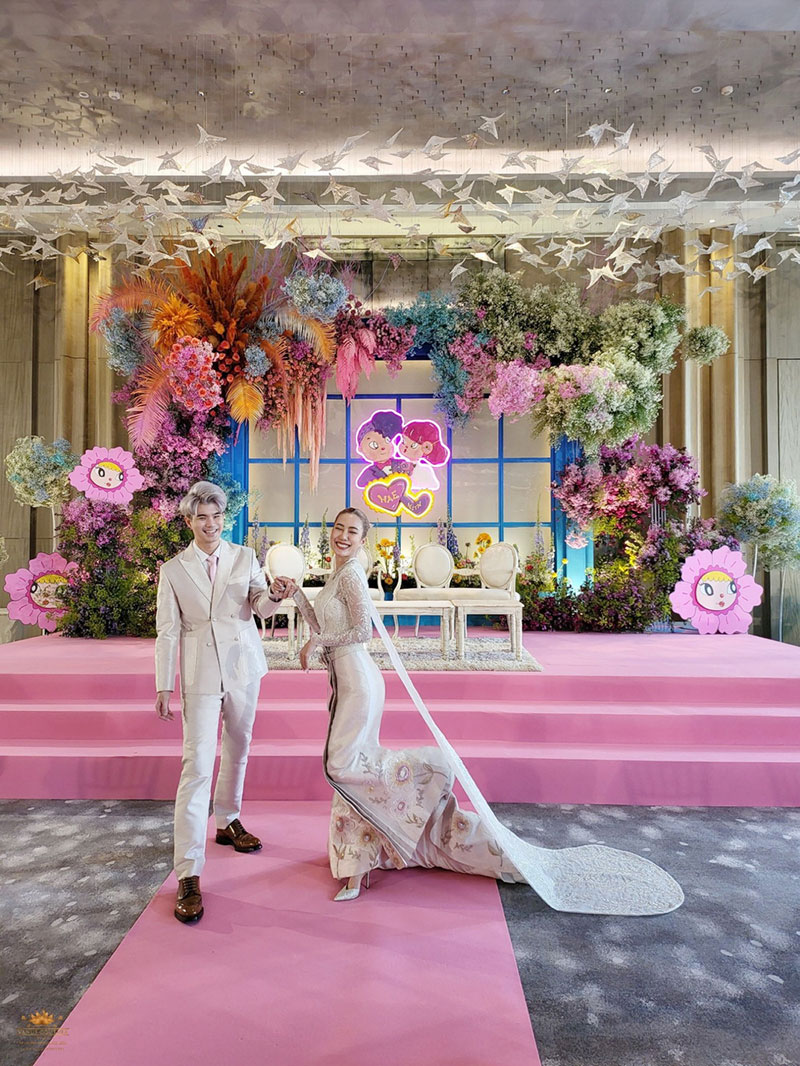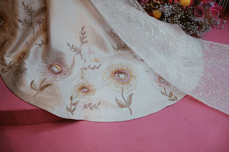 โดยทีมงานของทางห้องเสื้อได้นำลวดลายมาใส่สีใหม่ และมีงานปักแบบไทยโบราณ นำมาจัดวางที่ตัวกระโปรงของเจ้าสาว เป็นความงดงามที่มีลายเซ็นเฉพาะแบบ และยังไม่เคยเห็นจากที่ไหนมาก่อน เสริมลุคให้ดูหรูหรามากขึ้น ด้วยการประดับด้วยเข็มขัดงานศิลปะโบราณจากครูช่างศิลปาชีพฯ (อ.ไพโรจน์ สืบสาน) ต่างหูเพชรและเข็มกลัดเพชรจาก Prima Gold (สัญลักษณ์เลข๑ ที่เป็นสมบัติตกทอดจากตระกูลเจ้าบ่าวเจ้าของแบรนด์ พรีม่าโกลด์) ร้อยเรียงกันจนเรียกได้ว่าเป็นผลงานศิลปะชิ้นเอก ที่เกิดจากความเป็นตัวตนของทั้งคู่จริงๆ