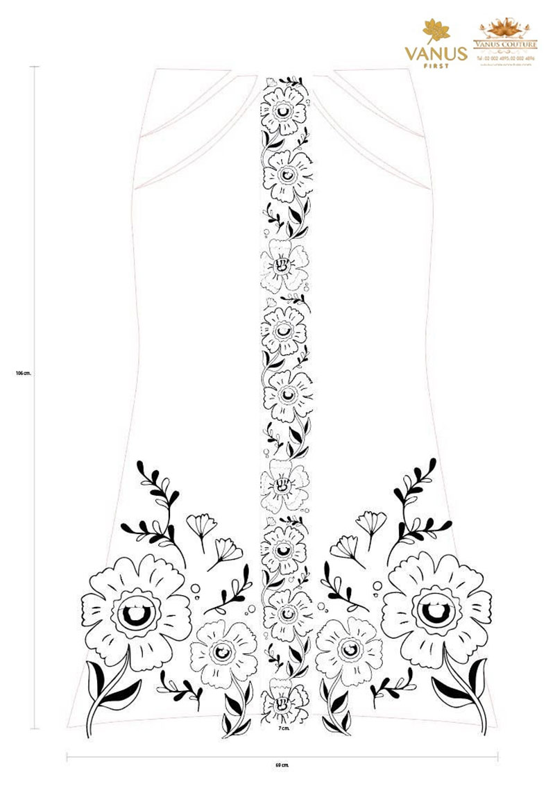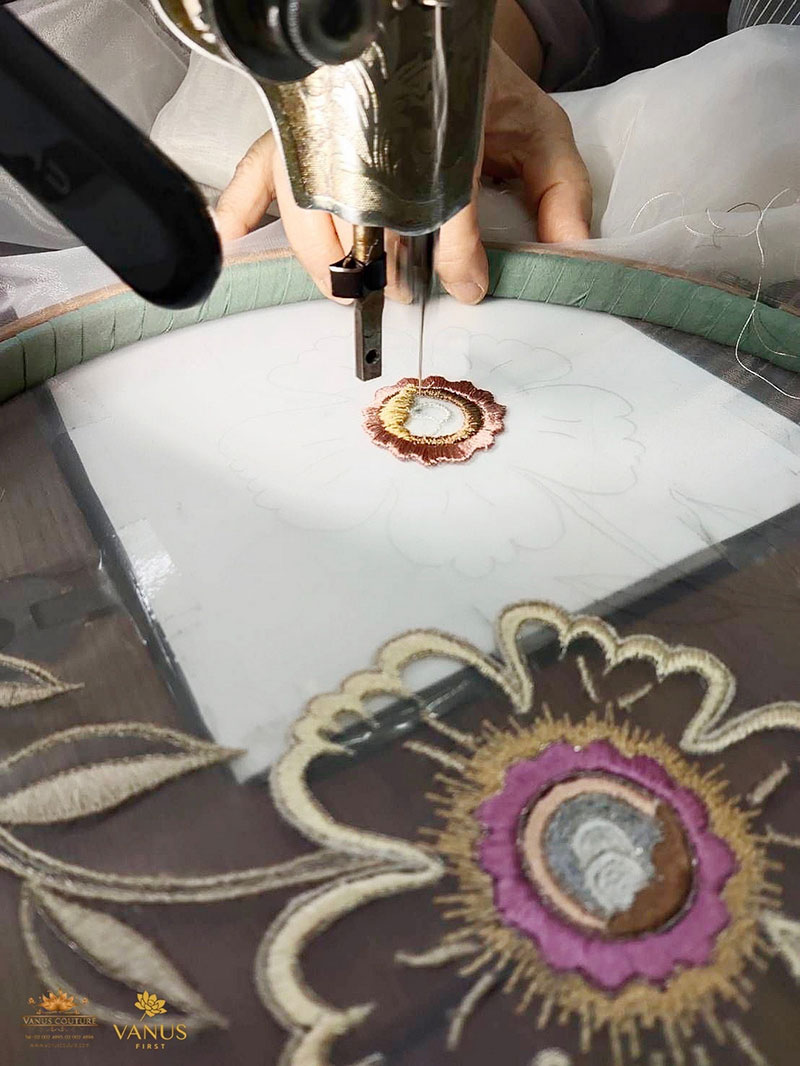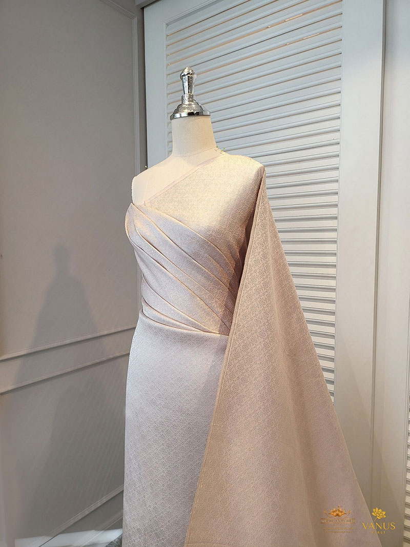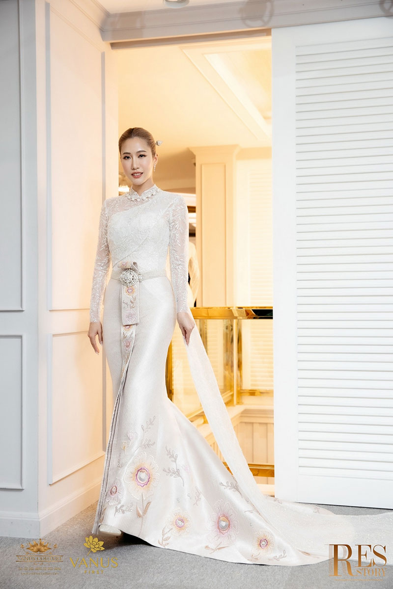 จากนั้นทางห้องเสื้อจึงได้นำมาออกแบบตัดเย็บ ตัวเสื้อด้านบนใช้ผ้าปักคริสตัลใสด้วยลวดลายกิ่ง ก้าน ใบ แบบฝรั่งเศสพร้อมกับนำมาประดิษฐ์ทำเป็นสไบมีความโปร่งใส ช่วงของผ้านุ่ง นำผ้าที่สั่งทอพิเศษนำมาตัดเย็บเป็นรูปทรงของกระโปรงทรงเมอร์เมด แต่ยังคงมีจีบหน้านางและชายพก เพื่อยังคงรูปแบบและอัตลักษณ์ของความเป็นชุดไทยอยู่