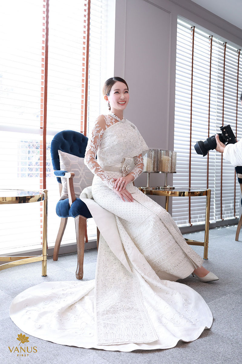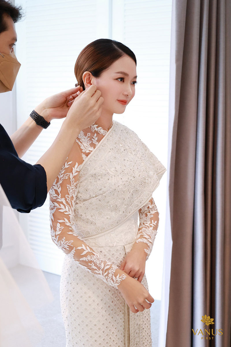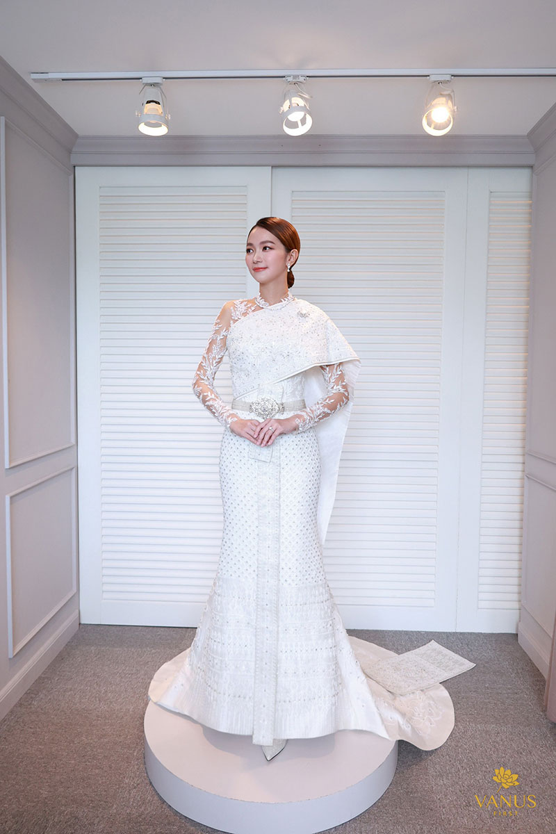 เปิดตัวเจ้าสาวมาในลุคชุดไทยศิวาลัยประยุกต์สีขาวทรงหางปลา รูปแบบของงานดีไซน์ยังคงคอนเซปต์น้อยแต่มากเรียบแต่โก้ตามแบบฉบับของ วนัช กูตูร์ เช่นเดิม วัตถุดิบที่นำมาใช้ในการตัดเย็บ เน้นความเป็นมา ความสวยงาม และทรงคุณค่า โดยเฉพาะผ้าไหมลำพูนสีขาว ivory ผืนที่ใช้ตัดเย็บชุดเจ้าสาว เป็นผ้าไหมที่สั่งทอขึ้นมาใหม่เป็นพิเศษ และขึ้นทะเบียนรับรองผลิตภัณฑ์ผ้าไหมไทย ตรานกยูงพระราชทาน จากกรมหม่อนไหม กระทรวงเกษตรและสหกรณ์