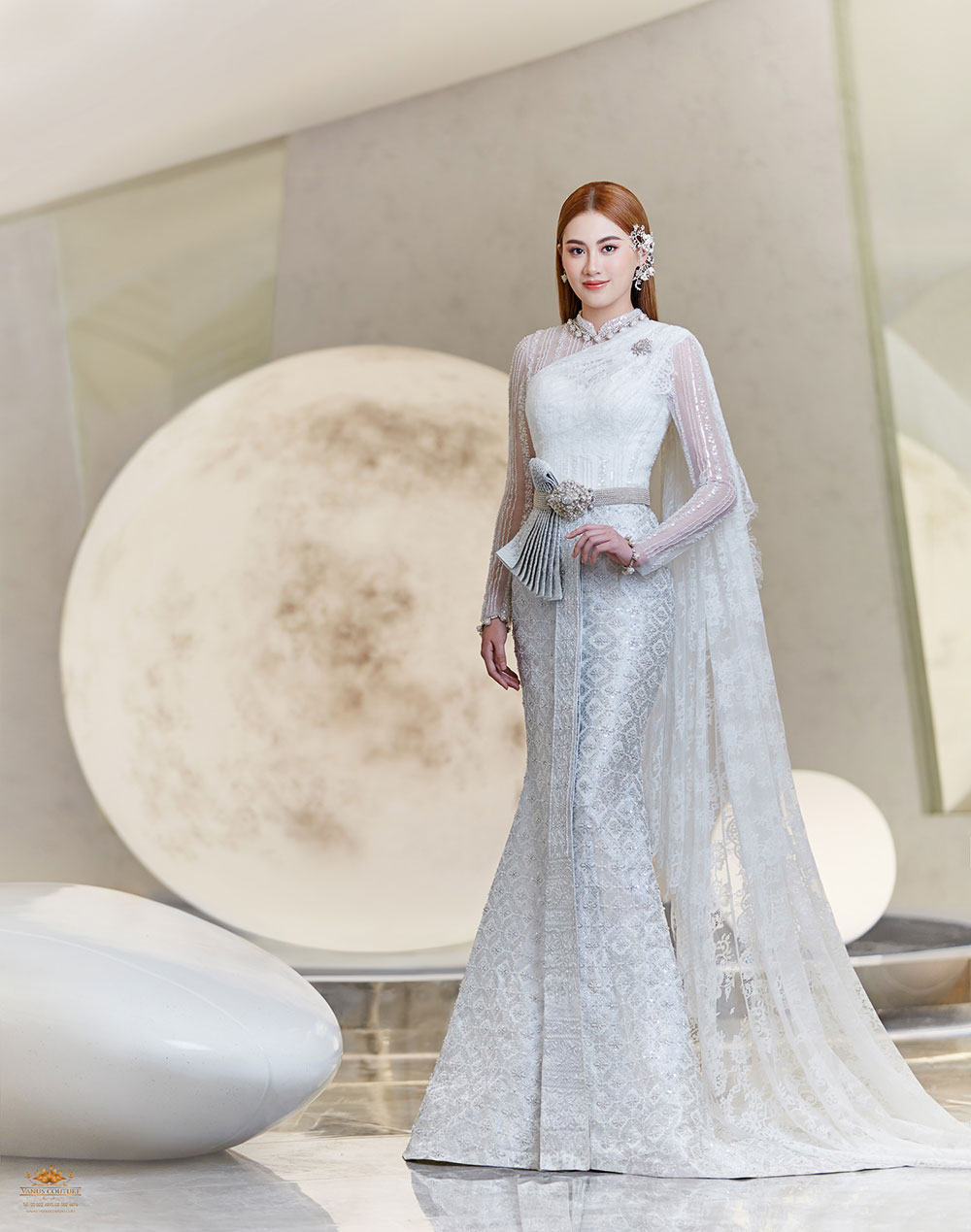 จึงนำมาสู่โทนสีชุดไทยที่เลือกใช้จะเน้นเป็น สีขาวของดวงดารา ดวงจันทร์ และสีของบรรยากาศของท้องฟ้าที่สว่างไสวในคืนพระจันทร์เต็มดวง รวมถึงลวดลายปัดอันวิจิตรงดงามระยิบระยับจับตาที่อยู่บนผ้า ผสมผสานกับคริสตัลแท้ที่บรรจงปักลงในไหมแท้ทอมือ