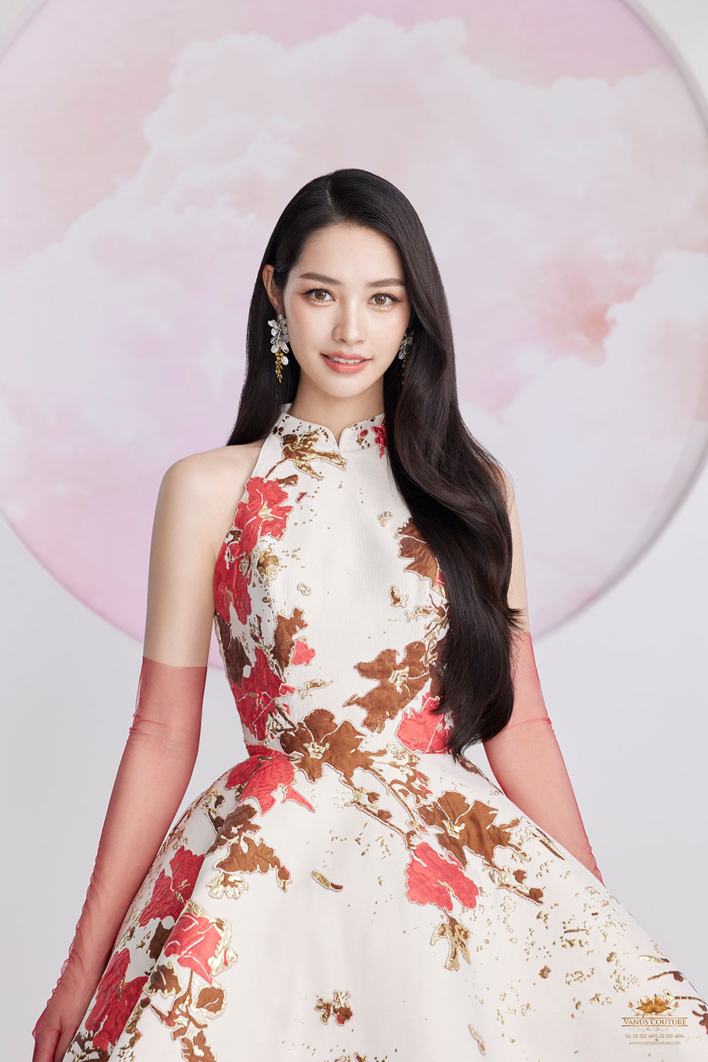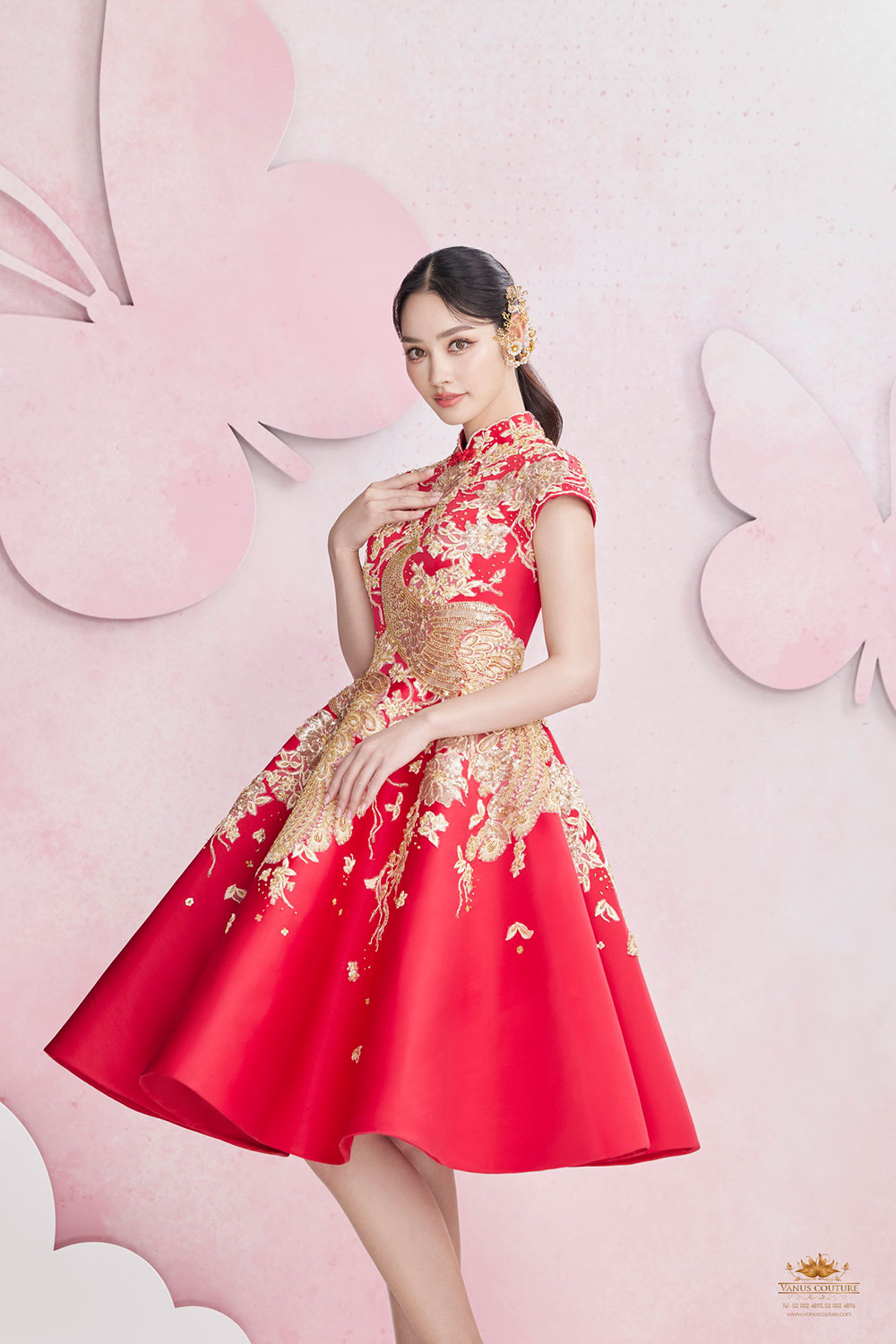 ปิดท้ายด้วย ชุดยกน้ำชาชุดที่ 10 สีแดงลายหงส์สีทองคำ ตัวเสื้อเป็นผ้าไหมซาตินสีแดงสด แขนล้ำช่วยให้ลำแขนของผู้สวมใส่ให้ดูเรียวและเล็กลง ตัวเสื้อวางด้วยลูกไม้นำเข้าและปักด้วยสวารอฟสกี้นำเข้าจากประเทศออสเตรียสีทองคำระยิบระยับจับตา ออกแบบและวาดลวดลายของดอกไม้และหงส์จีนสีทองคำ ซึ่งเป็นสัญลักษณ์ของความสมบูรณ์แบบ และความบริสุทธิ์