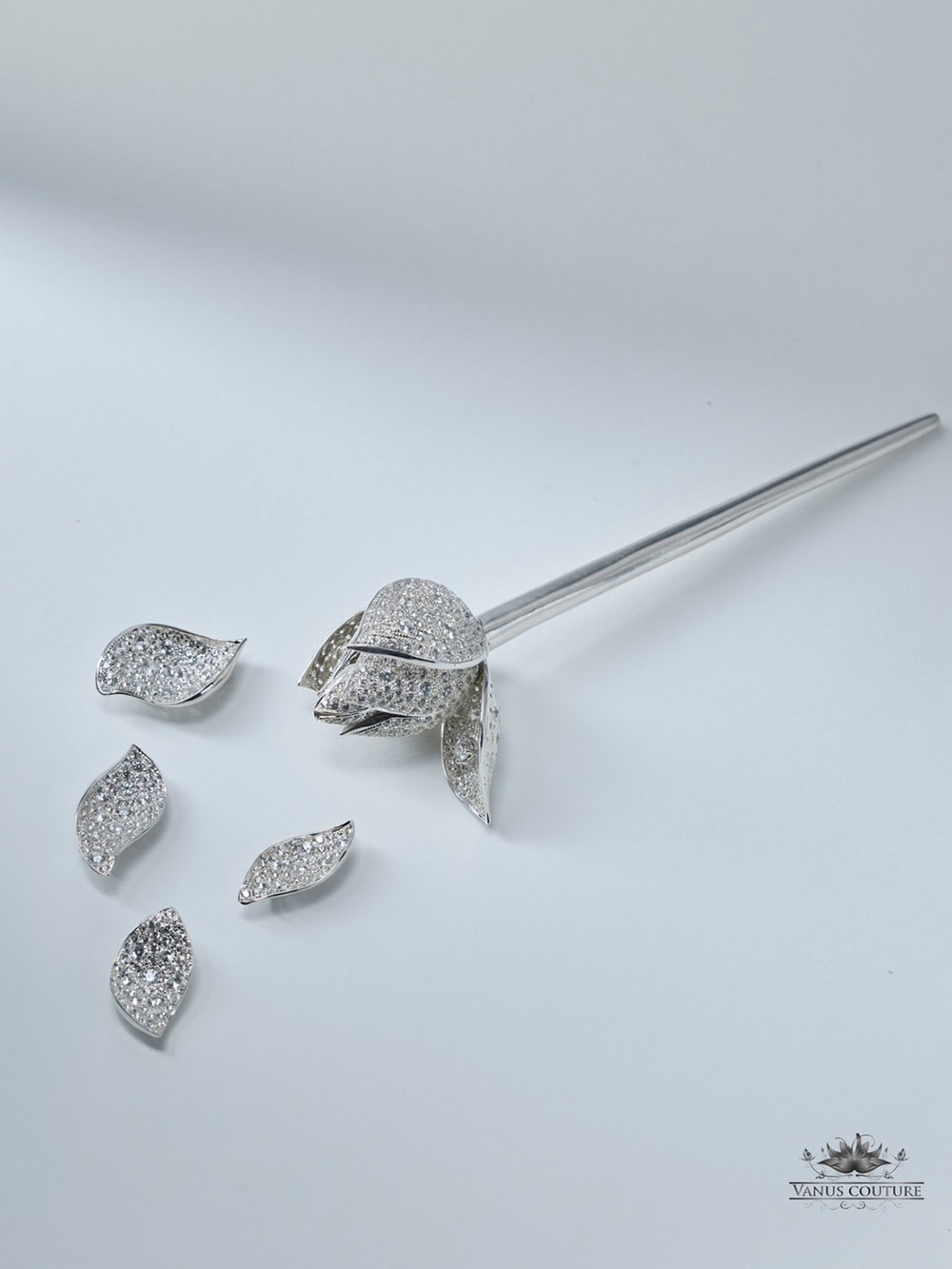 2. ปิ่นปักผม “หยาดเพชร” – ปิ่นทรงบัวตูมกำลังผลิบาน ประดับเพทายขาวและโอปอล เปรียบดั่งหยดน้ำค้างแห่งความอุดมสมบูรณ์