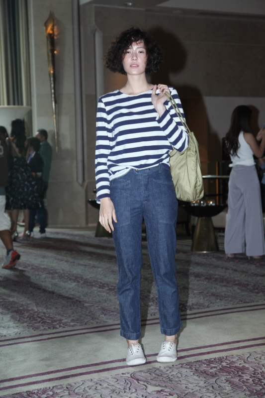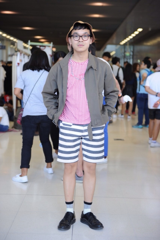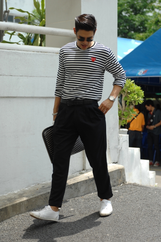 ต่าย นัฐฐพนธ์ เสื้อลายขวางของ Play (Comme Des Garcons) สวมทับกับกางเกงสไตล์อากง คาดด้วยเข็ดขัด เรียบๆ แต่ดูแนว และดูดี